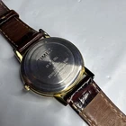 This is a men's wristwatch made by Timex, featuring a gold-tone case with a 37mm size and a brown band. The white dial has a 12-hour dial, day/date display, and backlight. The watch is quartz movement and water-resistant up to 30m (3ATM). It is an analog display watch with a model name of TIMEX Indiglo.