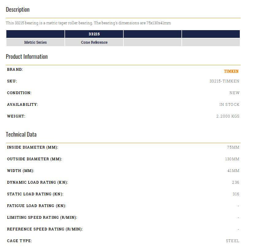 $ 50.38TIMKEN 33216 Taper Roller Bearing 80x140x46mm Single Piece NN