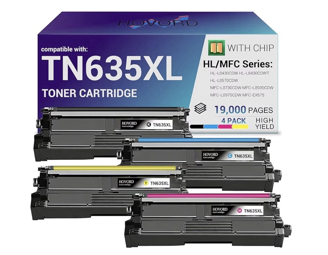 TN635XL Compatible Toner Cartridge Set – 4 Pack (CMYK) – NEW SEALED High-quality compatible toner set designed for Brother printers. Perfect for home, office, or business use with reliable performance and vibrant color output. FEATURES • High yield capacity – up to approx. 19,000 total pages • Built-in chip for easy installation and printer recognition • Sharp text and vivid color printing • Consistent, reliable performance ⸻ 🖨️ COMPATIBILITY Works with: • HL-L8430CDW • HL-L8430CDWT • HL-L8570CDW • MFC-L8730CDW • MFC-L8930CDW • MFC-L8970CDW • MFC-EX575 CONDITION Brand new, factory sealed in original packaging ⸻ SHIPPING FAST SHIPPING – SAME DAY HANDLING AVAILABLE