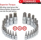 TOMMARS 26-PC Torx Socket Set, 26-Piece, Bit Socet T10-t70 & Tt10-tt70 Product Details Brand: TOMMARS Material: Chrome Vanadium Steel, S2 Steel Drive System: 3/8", 1/2" Finish Type: Mirror Chrome Finish Number of Pieces: 26 Drive Bit Shank Style: star-drive Manufacturer: TOMMARS Part Number: K1T95623 Item Weight: 3.39 pounds Package Dimensions: 13.82 x 7.99 x 2.36 inches Item model number: K1T95623 Size: 26-Piece Color: Torx Bit Socet T10-t70 & Tt10-tt70 Style: Torx Bit Socket Finish: Mirror Chrome Finish Item Package Quantity: 1 Compatible Fastener Range: 0.25 inches Batteries Included?: No Batteries Required?: No Brand: TOMMARS Material: Chrome Vanadium Steel, S2 Steel Drive System: 3/8", 1/2" Finish Type: Mirror Chrome Finish Number of Pieces: 26 Torx bit socket set includes: 1/4" drive T10, T15, T20, T25, T27, T30, T35, T40, 3/8" drive T45, T50, 1/2" drive T55, T60, T70; Tamper proof security torx bit socket includes: 1/4" drive TT10, TT15, TT20, TT25, TT27, TT30, TT35, TT40, 3/8" drive TT45, TT50, 1/2" drive TT55, TT60, TT70 These torx bit sockets are crafted from a combination of S2 alloy steel and chrome vanadium steel, providing excellent resistance to rust and exceptional strength and durability. They're ideal for loosening stubborn screws. Each torx bit is precisely sized and chamfered to ensure a perfect fit and to reduce wear on fasteners. This torx bit socket set is compatible with a ratchet, making it versatile for servicing vehicles. This set includes the essential sizes to work on bikes, automobiles, appliances, lawn equipment, machinery, ect. The size markings on these torx bit sockets are large, clear, and die-stamped, ensuring easy readability that won't wear off over time. Additionally, the set comes with a storage case for convenient transport and quick organization.