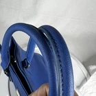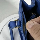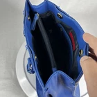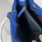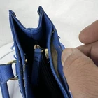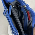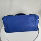 This Tommy Hilfiger duffle bag in royal blue is a must-have for any fashion-savvy woman. With a spacious interior and a comfortable double handle, this medium-sized bag is perfect for everyday use. The solid pattern and classic theme make it a versatile accessory that can be paired with any outfit. FLAWS - see last two pics- separation happening at top of purse. The bag features a blue handle/strap color that adds a pop of color to the overall design. The lining color is black, which complements the exterior color and gives it a sleek look. With a size of 13 inches in width and 8 inches in height, this duffle bag is ideal for carrying all your essentials. It's a great addition to any collection and a timeless piece that will never go out of style. FLAWS - see last two pics- separation happening at top of purse. (A1)