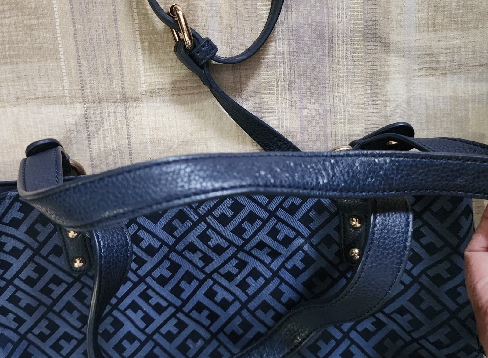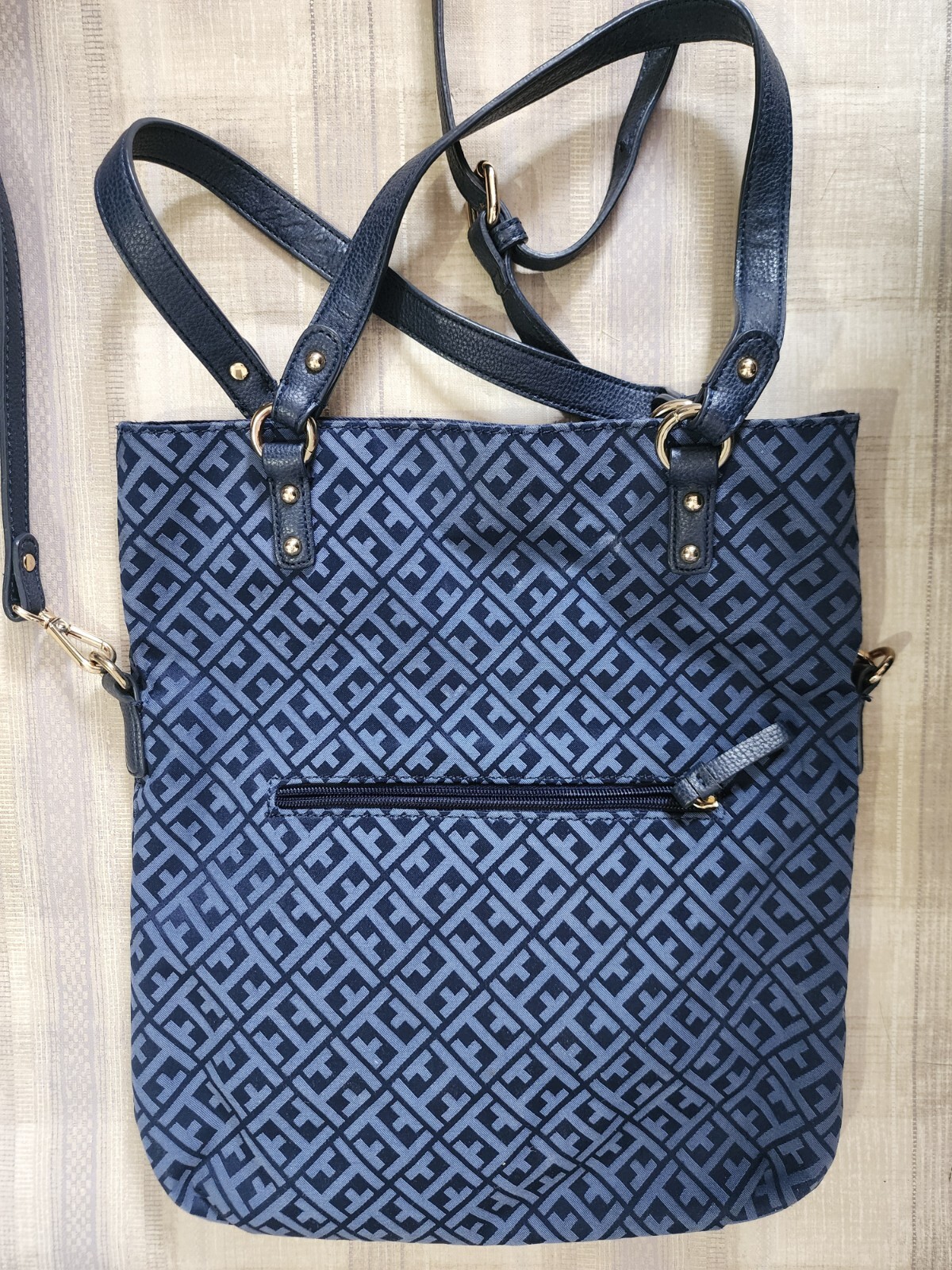 Tommy hilfiger tote crossbody and shoulder bag. Crossbody strap is adjustable and removable. Shoulder strap has some rubbing so the leather looks a bit loose on section shown in pics but is not ripped. One zip pocket outside. On the inside one zip and 2 slip pockets. Size approx when laid flat 14 x 13 inches. 8 inch shoulder drop. Golden colour hardware. logo in front which has slight scratches but is not visible from 4 feet. See pics.