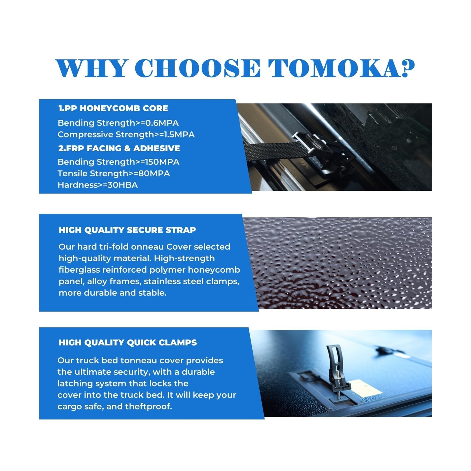 TOMOKA Hard Quad-fold Truck Bed Tonneau Cover Compatible for 2007-2026 Chevy Silverado/GMC Sierra 1500 5.8 FT (68.4") Bed Description Features: FITMENT Hard Quad Fold Truck Bed Cover is compatible with 2007-2026 Chevy Silverado /GMC Sierra 1500 5.8FT(69.3") inch Bed MATERIAL High-quality FRP material - FRP material has high strength and strong impact resistance, which can resist external risks well and protect the goods in your truck from damage. Hard Quad Fold Bed Cover is not only lighter in weight, but also more scratch resistant than aluminum alloy and has higher compressive strength. MULTI-FUNCTION Waterproofing, snow, dust, and UV Preventing, Anti-fall off. Impact resistance, scratch resistance, vibration resistance, and matte black reduced light pollution at night. To prevent the cover slide from the bed while driving on the road, we use a latching system to keep the tailgate well sealed. NO DRILLING INSTALLATION Easy to install without drilling. Providing instructions for your reference. Simple operation with good use. Product Details: Brand: TOMOKA Style: Hard Quad-fold Exterior Finish: Aluminum Material: Fiberglass Reinforced Polymer, Polypropylene, Stainless Steel Lock Type: Tailgate Brand: TOMOKA Style: Hard Quad-fold Exterior Finish: Aluminum Material: Fiberglass Reinforced Polymer, Polypropylene, Stainless Steel Lock Type: Tailgate Manufacturer: Tomoka Model: TMK-NHQ032 Item Weight: 66.6 pounds Package Dimensions: 70.47 x 27.56 x 5.71 inches Item model number: NHQ032 Manufacturer Part Number: TMK-214H-2089 Special Features: Matte black, Mounting Hardware Included, US Local Shipping, Water proof and Anti-moisture Lift Type: manual Date First Available: March 6, 2024 Delivery We Do Not Ship Outside of the Continental US. Return Policy All items qualify for returns within 30 days of receipt. Buyer is responsible for return shipping on any item that is not damaged. Feedback We take our reputation seriously, we buy and sell online, so we understand the value of trust. If you are unsatisfied with your order, please contact us and we will work with you to resolve it to your satisfaction.