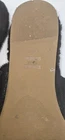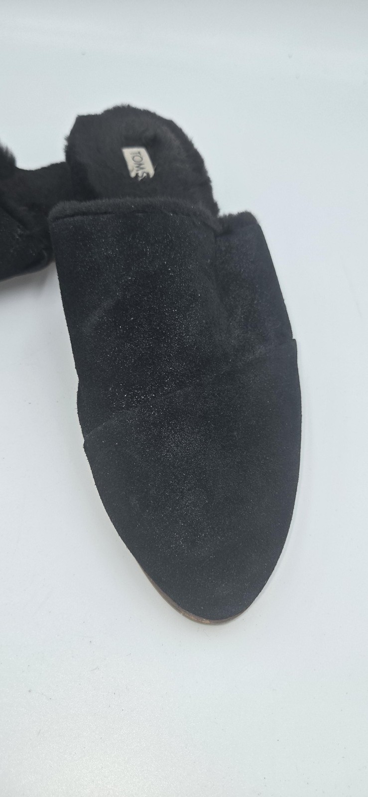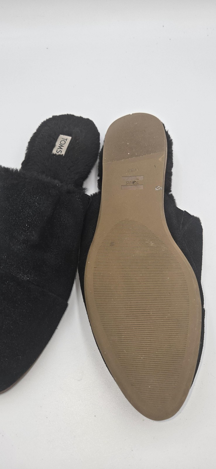 Brand: TOMS Style: Jade womens mule shoes in a cozy backless slip-on flat silhouette. Color: Black metallic suede upper with matching black faux fur lining. Size on sole: Womens 8.5 B (medium width); marking reads W8.5. Materials: Suede upper, soft faux fur lining, rubber outsole. Details: Pointed closed toe, low-profile flat heel, cushioned and furry interior for added warmth, rubber outsole with fine ridged tread, subtle TOMS branding on footbed and outsole. UPC: 195703572661