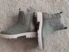 TOMS Skylar pull on ankle boots ~ elastic side goring ~ front and back pull tags ~ quilted fabric back ~ dark olive green upper ~ beige lug outsoles ~ TOMS logo ~ size 7.5M ~ NWT attached.