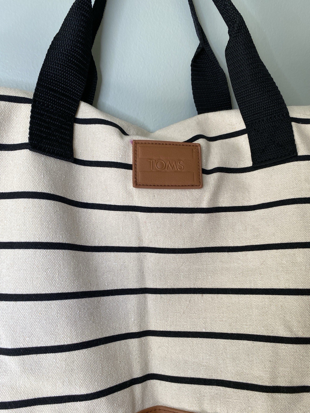TOMS Striped OVERNIGHTER Tote CARRY-ON Weekender Shoulder Travel Bag DSW Black stripe on cream background with TOMS logo patch. See pictures for minor mark