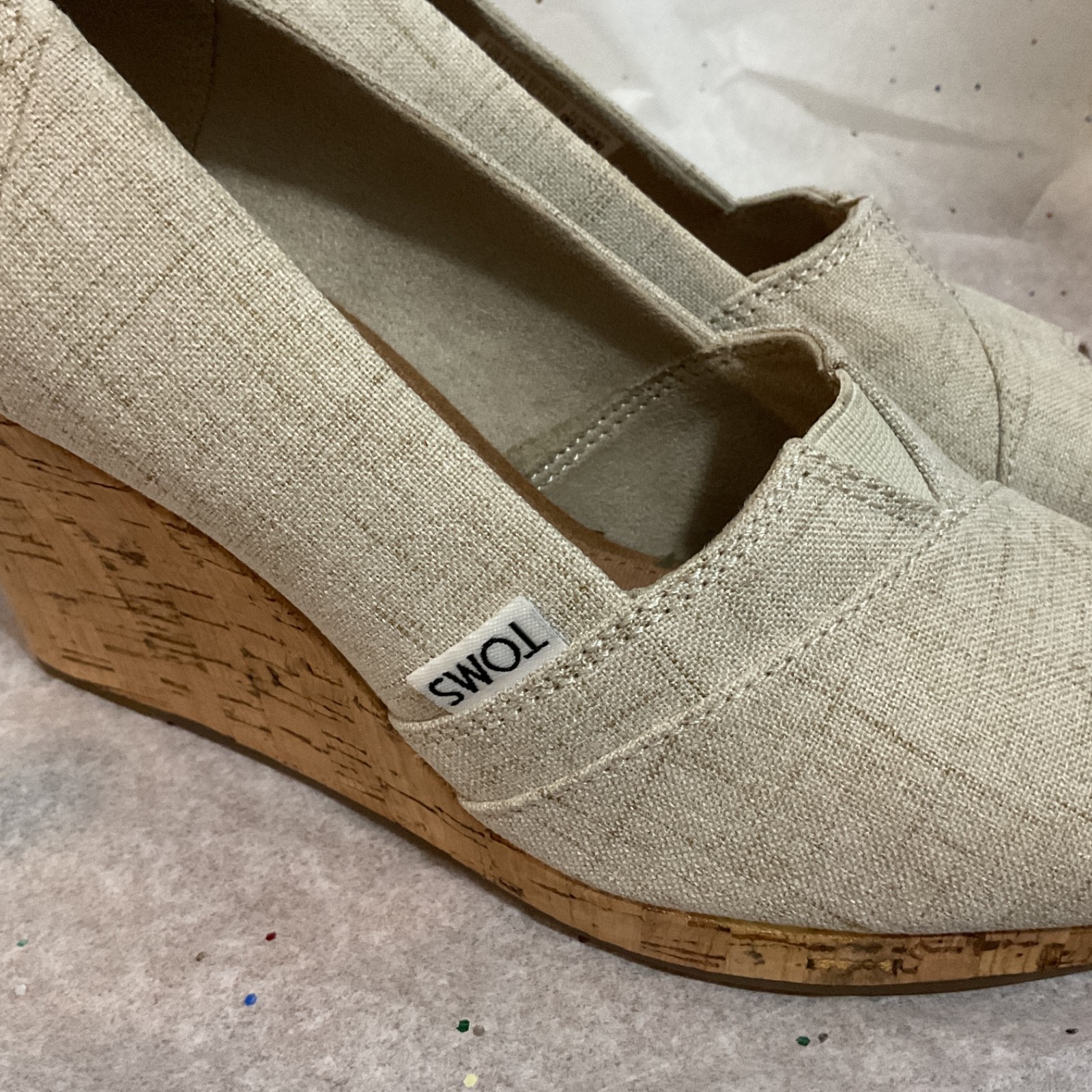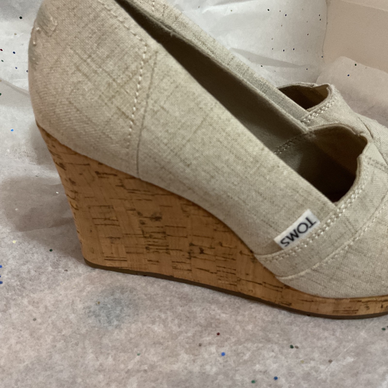 The TOMS Women's Classic Espadrille Wedge Sandal in Natural Crosshatch Jacquard, size 6.5, features a stylish slip-on design with a high wedge heel. Made with synthetic material, this beige-colored sandal has a solid pattern and an open toe design. The nature-themed sandal is perfect for women looking for a comfortable and fashionable footwear option. Per reviews, this shoe tends to run small.