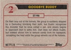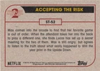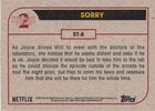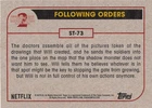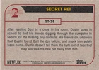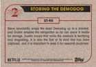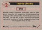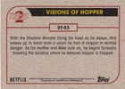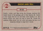This listing is for your choice of any available 2019 Topps Stranger Things Season 2 card or sticker from the drop-down menu above. Photos show front and backside of each card, be sure to scroll sideways to view front and backside photos! Domestic orders of single card(s) will normally ship via eBay Standard Envelope. As you may know, this tracking is not the most reliable, so if you would like to upgrade to a more reliable tracking option, please choose the USPS Ground Advantage shipping option when you check out. Any questions? Please ask before buying. As with all of my "pick-a-card" listings, I will be shipping with "eBay Standard Envelope". The rules of this envelope state that it cannot be too thick, so please expect your order to be packaged as follows: 1 to 6 cards will be slid into a single sleeve, the sleeve will then be slid inside of a semi-rigid Card-Saver. 7 to 12 cards will be slid into a double sleeve, 13 to 18 cards into a triple sleeve, 19 to 24 cards into a quadruple sleeve(up to six cards per sleeve). The double, triple and quadruple sleeve shipping will not have the Card-Saver. If you buy more than 1 card and want it packaged with more than 1 Card-Saver(or 1 sleeve per card), I kindly ask that you contact me before purchasing to be sure that this is possible to have it done with the stated shipping charge, or if additional shipping would be required. If you do not contact me, then you can expect to receive your order packaged as I have explained here. Please do not expect rigid top-loaders to be included, I don't normally keep a lot of them in stock, but if you message me prior to ordering I will be able to see if I have any that can be included with your order - additional shipping may be required. In order to get free combined shipping from this and any of my other "pick-a-card" listings, you must add all of your cards to the cart and check out when you are done shopping. If you do not use the cart you will be overpaying on shipping and I cannot refund you on over-payed shipping. So please use the cart and get your FREE COMBINED SHIPPING!