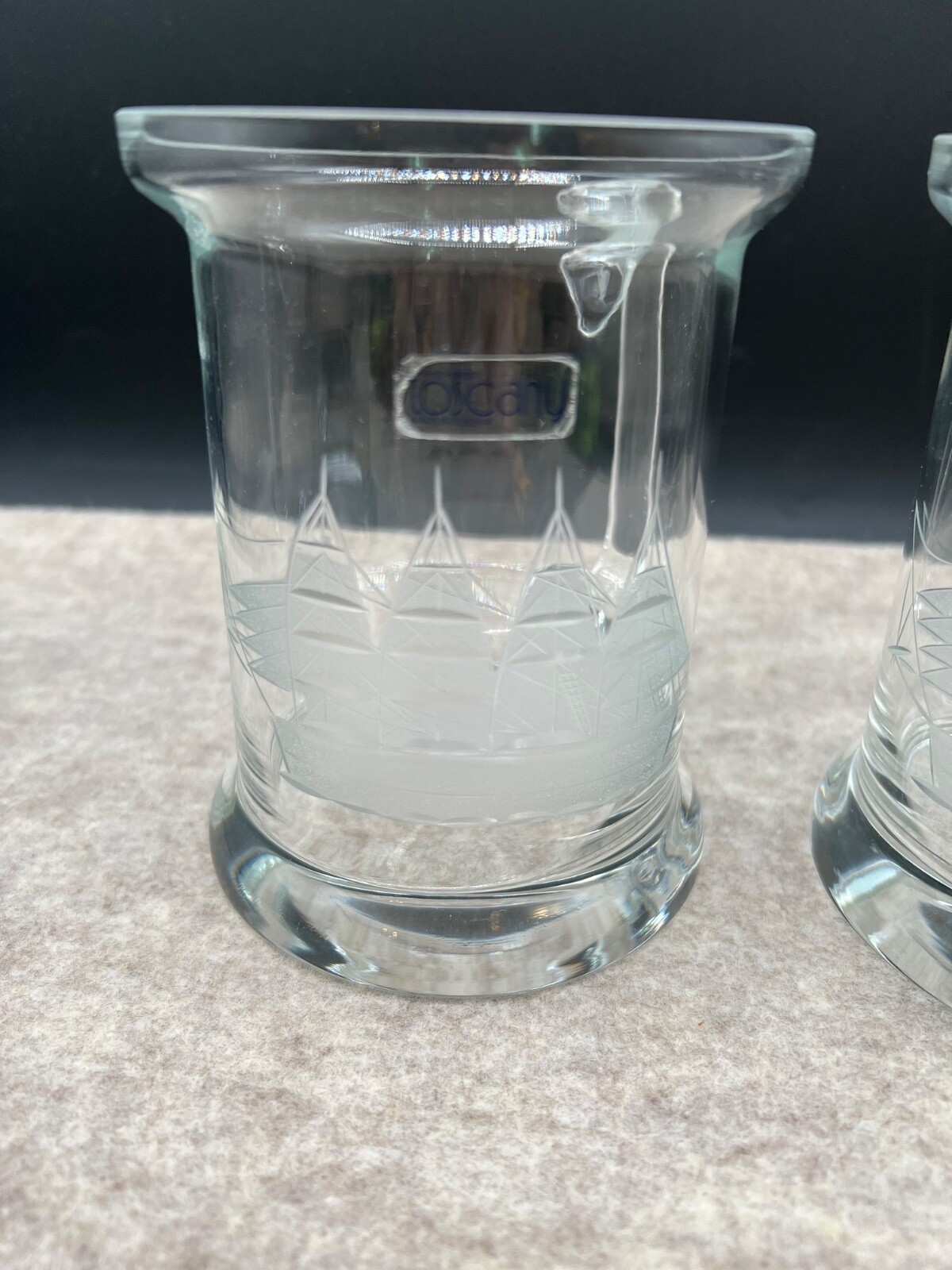 Elevate your barware collection with the TOSCANY Crystal Clipper Mugs, a luxurious addition that blends functionality with a nautical aesthetic. Each 4 1/2" stein is meticulously handcrafted from premium crystal glass, featuring an etched ship design that adds a touch of sophistication to your drinks experience. The round mugs have a 3 1/2" diameter and hold up to 16 ozs, ideal for enjoying your favorite spirits. Crafted with precision, these mugs are a testament to the artistry of hand-blown glass. The clear crystal, combined with the intricate etching, makes each piece a unique work of art. Designed in Romania, the mugs are not just glasses but treasured keepsakes. To maintain their elegance, hand washing is recommended. Add these contemporary originals to your collection and indulge in the luxury of Toscany craftsmanship. set of 2