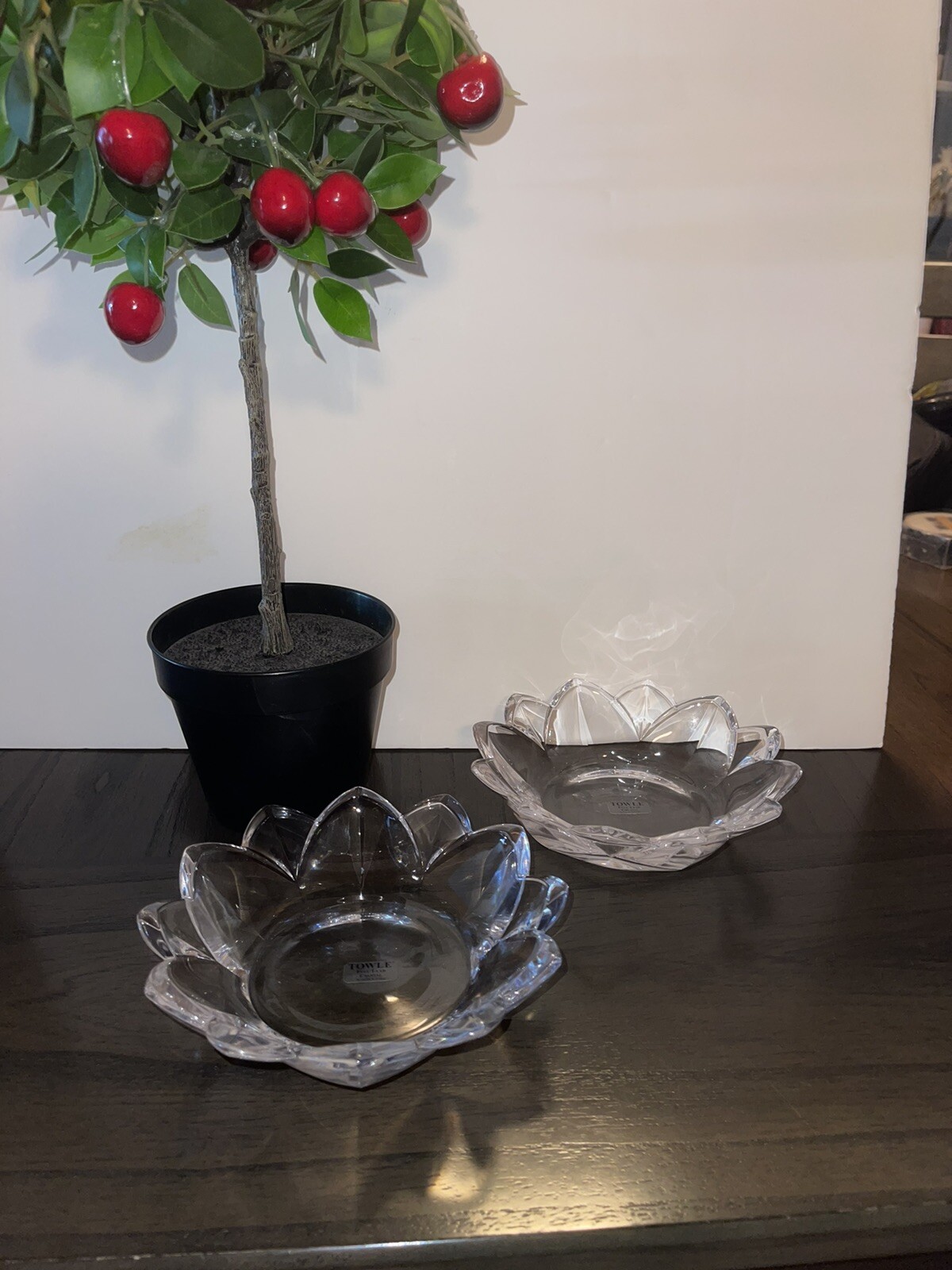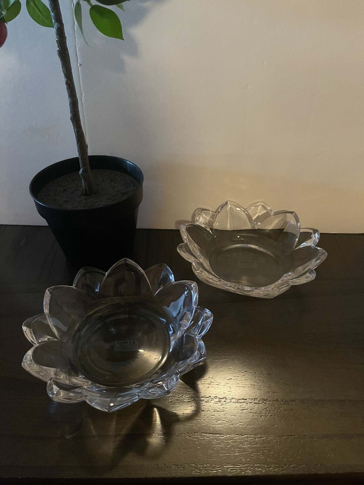 New never used TOWLE FULL LEAD CRYSTAL FLOWER CANDY DISH. Can be used for decor or anything. Beautiful flower shape crystal dishes. Set of 2 Please note these can be shipped while I am on vacation however they will be shipped from California via USPS or UPS depending on pricing. Decorative plant not included