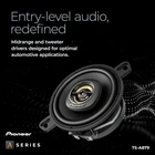 2-Way Design - Enhance your car accessories with this 2-way design speaker, meaning they have separate drivers for reproducing different frequency ranges. Results in more accurate and balanced sound reproduction. Power Handling - Maximum power handling of 450 watts and a continuous power handling of 100 watts, these speakers deliver dynamic sound. Crisp highs or deep lows ensure that you can experience a wide range of frequencies with clarity and accuracy. Frequency Response - Receive a rich and immersive sound reproduction across different music genres. This car audio speaker contains a broad range of audio frequencies with a response range of 850 Hz to 33 kHz. Sensitivity - The sensitivity rating of 85 dB ensures that the speakers can produce clear and loud sound even with lower power inputs. This means you can enjoy your music without distortion, even at higher volume levels. Direct Fit OEM Upgrade - The Pioneer TS-A879 is designed to be compatible with a wide range of car audio systems and can be used as a direct replacement for factory-installed speakers or as an upgrade to existing audio setups. Upgrade your car's audio system with the Pioneer TS-A879 3.5” 2-Way Car Speakers. These speakers are designed to deliver enhanced sound quality and performance, allowing you to enjoy your favorite music like never before. These speakers are a popular choice for many car models. They fit seamlessly into standard speaker openings, making installation hassle-free. Whether you're replacing existing speakers or upgrading from factory-installed ones, the TS-A879 is designed to deliver superior audio reproduction. With a maximum power handling of 450 watts and a continuous power handling of 100 watts, the TS-A879 can handle higher power levels, allowing you to enjoy louder and more dynamic audio. The speakers are designed to deliver impressive volume levels without sacrificing clarity or causing distortion. Upgrade your car's audio system with the Pioneer TS-A879 2-Way Car Speakers. Experience improved sound quality, enhanced bass, and clear vocals, bringing your music to life on the road. Enjoy the Pioneer quality and elevate your in-car audio experience.