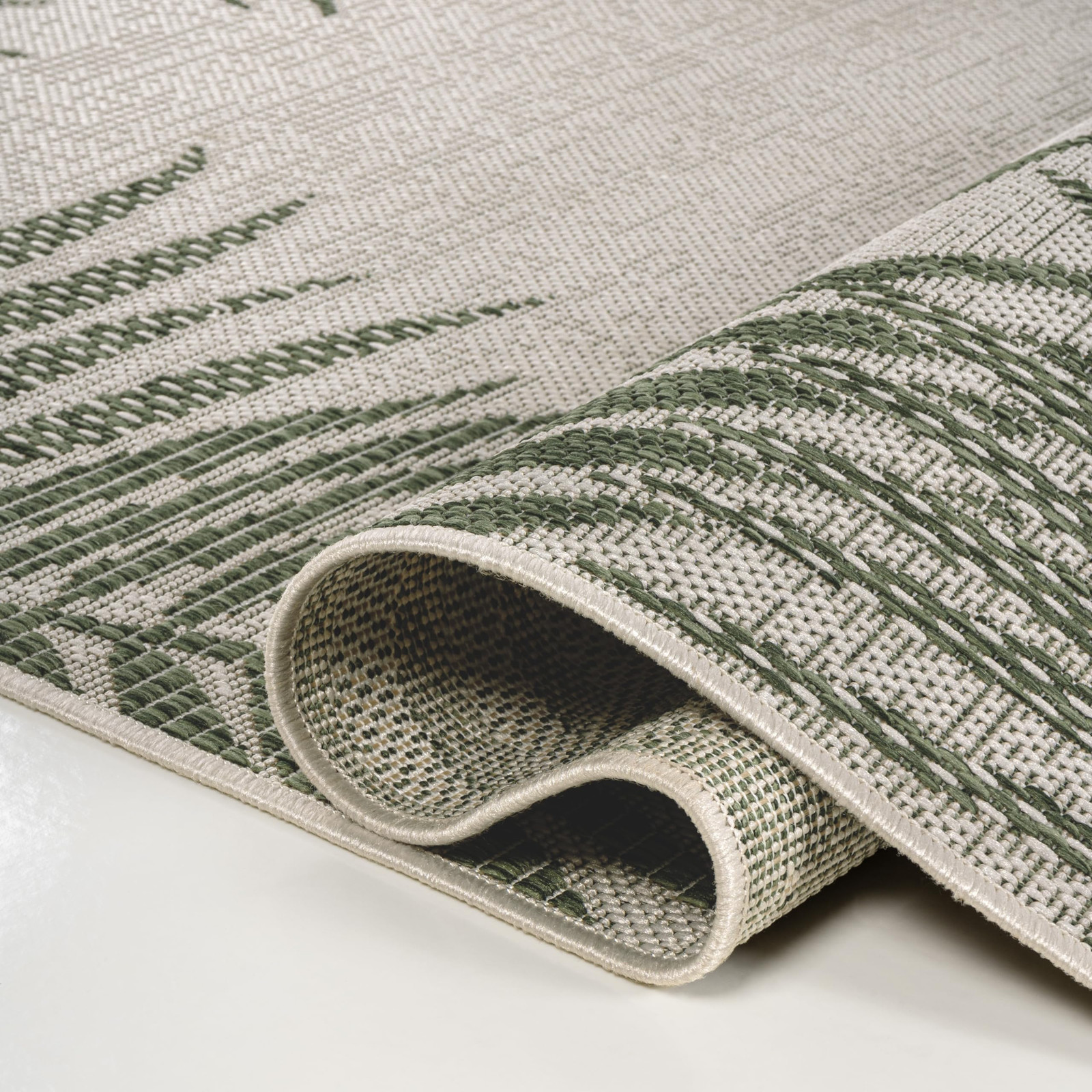Whether you live at the beach or just love tropical style, this rug's palm frond border adds a coastal vibe. Woven from durable synthetic fiber, the design features overlapping palm tree branches. Use this family-friendly rug on the porch, or indoors in the living room, dining room or bedroom. Woven design with a short 0.23" pile Crisp color scheme in shades of green and cream Durable woven construction is made from easy-care polypropylene 100% Polypropylene No backing, use of rug pad is recommended (sold separately)
