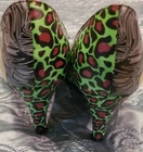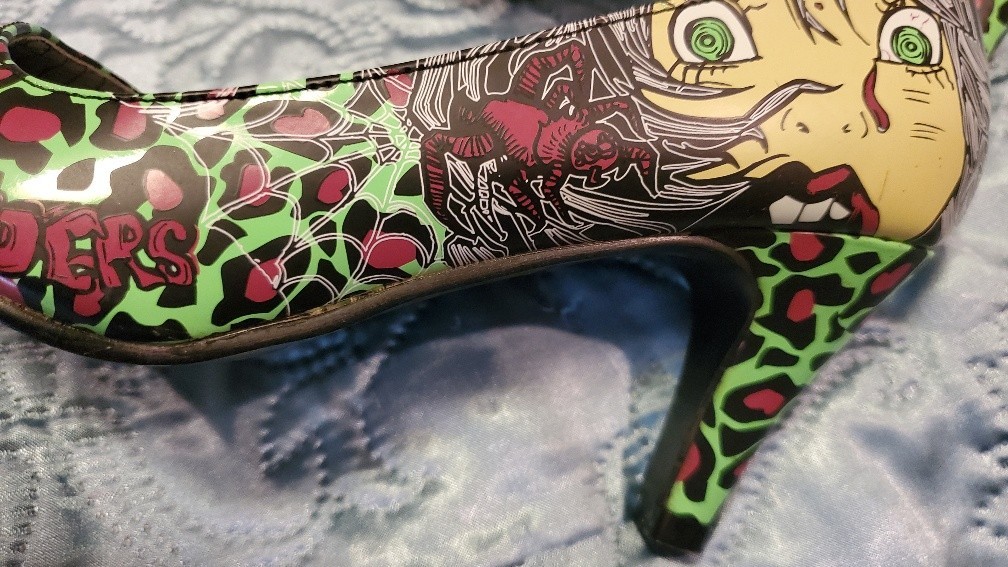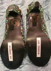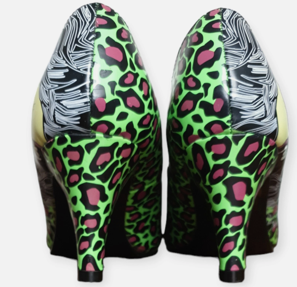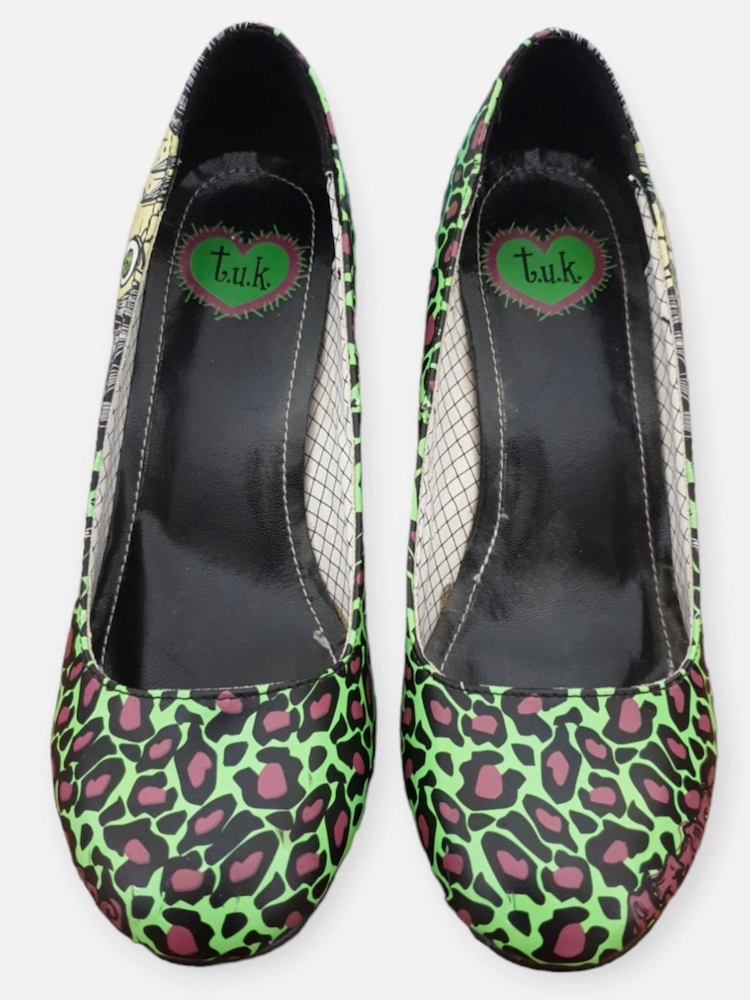 FUN pair of TUK shoes, Attack of the Killer Spiders, U.S. Size 7. Shoes are in EXCELLENT/LIKE NEW condition -- first 3 pics are from stock photos which may show the colors a bit better, last 5 are pics of the actual shoes. T.U.K. Women's Heels Size 7, Attack Of The Killer Spiders The TUK A7825L has PU uppers with an eclectic graphic print of a damsel in distress at the thought of 'Killer Spiders' on its outer side - perfect if you fancy yourself as Scarlette Johansson in 'Eight Legged Freaks' or Hollywood cheese and the 'Giant Spider Invasion'. Covering the front of the TUK ladies court shoe, from its rounded toe, along the inner side and 7cm high heel is a leopard print in black and purple on a bright green background. Inside, the A7825L is lined with a black white and black criss-cross print while its black insole has a well-padded heel pad.