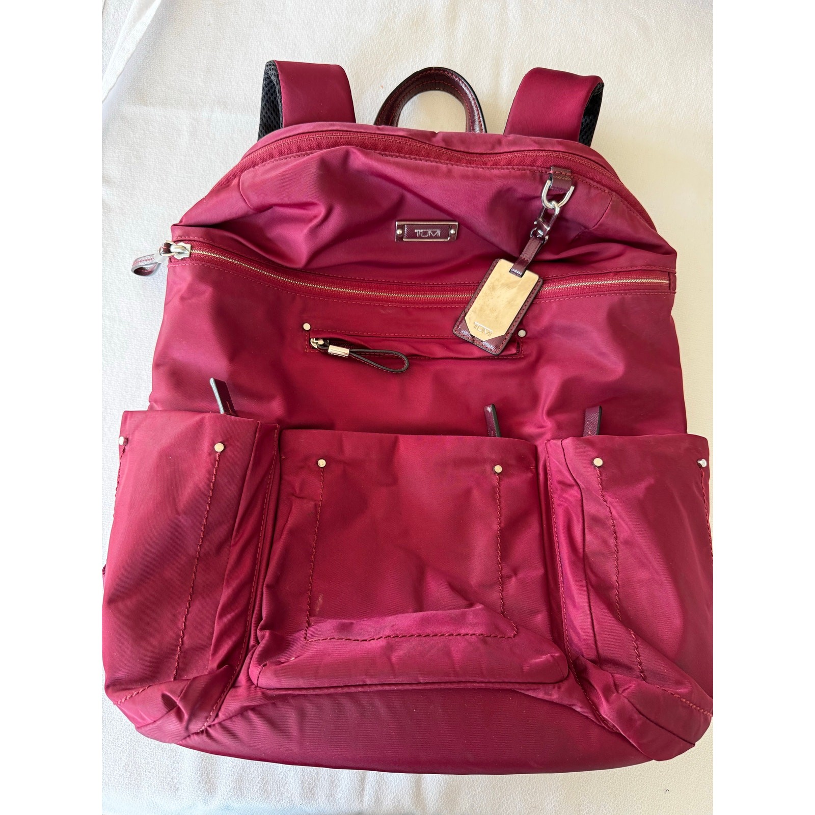 Great quality, heavy canvas nylon classic backpack from Tumi. Rich beautiful burgundy red with lots of compartments and pockets. A few small marks, see photos, but lot of life left.