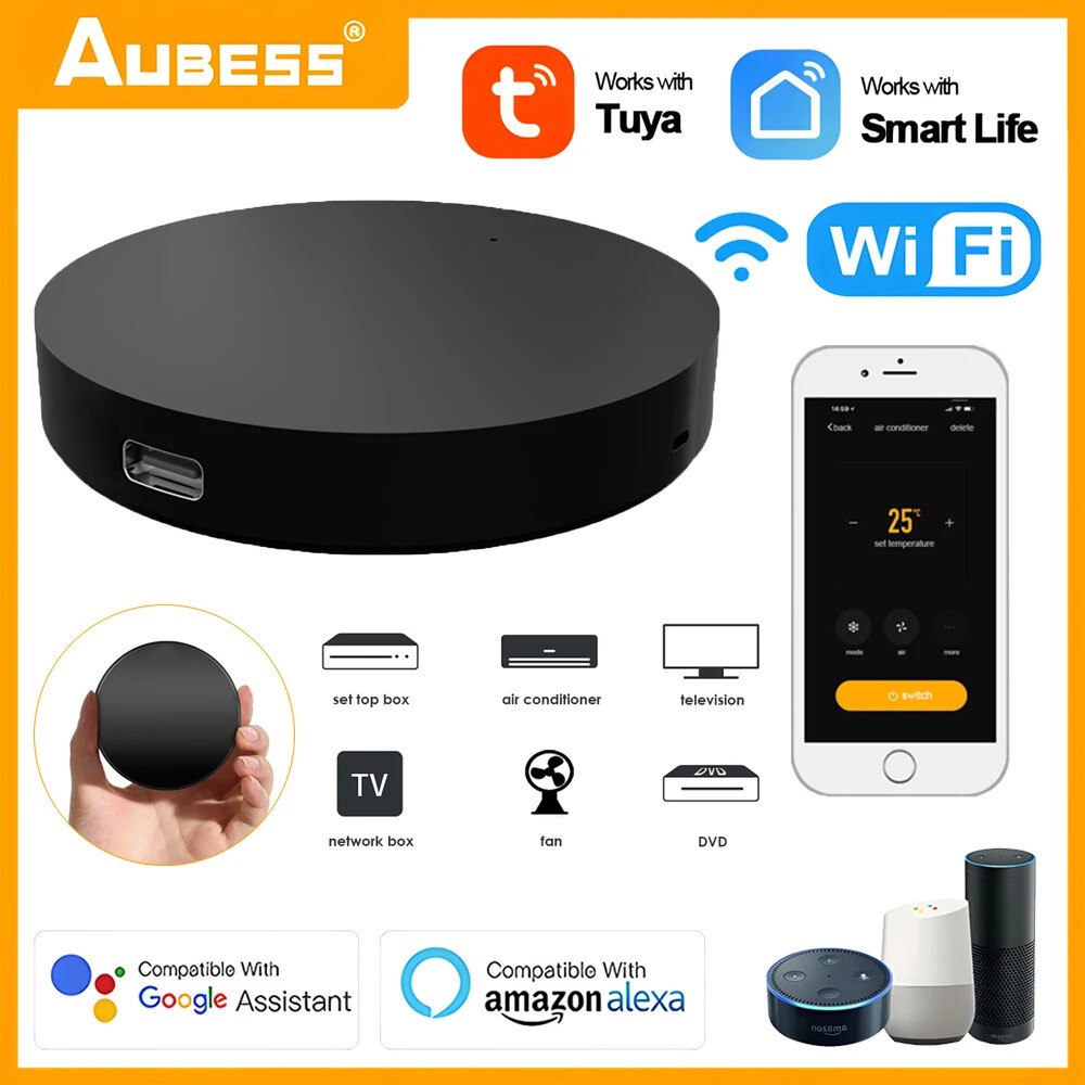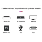 TUYA Smart IR Remote Controller WiFi Universal Infrared Smartlife APP Control For TV DVD AUD AC Works With Amz Alexa Google Home Description: With this Universal IR Remote Control, you may use your smart phone to control home appliances, such as STB(Set-Top-Box), TV Box, TV, Air Conditioner, Fan, DVD, etc. Compatible with most of brands, for details, please refer to the supported brand list in App. Besides, it has LEARNING FUNCTON, allows you to copy the key function of original remote control to App. Note: Not compatible with the home appliances which use RF or BLUETOOTH remote control. 【1.Massive IR Code Database】 Support 4000 brands, 50000 IR Code on cloud, supported devices library is constantly being updated by the cloud. 【2. App Remote Control】 Remote Control your home appliances by using “Tuya Smart” App in your smart phone anywhere anytime. For example: Switch on home A/C in advance, enjoying the comfortable temperature once you get home. 【3. Easy to install and add to app】 Once you plug the cable line into the device, the device starts to start, and then select the app's "auto scan" function to find device. The whole process takes only a few minutes. 【4. Voice Control】 By connecting Intelligent speaker, such as Amazon Alexa, Google Home, you are able to control your home appliances by voice. For example: Alexa, turn on TV; OK Google, set air conditioning temperature to 25 degrees. 【5. Scenario and Automation in App】 A scenario consists of 1 or more actions. By creating an “Scenario”, you may control multiple devices with one tap; By adding an “Automation” and interworking with other smart home devices, Wi-Fi remote control is able to execute actions automatically according to conditions, such as device status, weather and time. 【6. Timer and Automatic Trigger】 According to your living habits, set time switches for your home appliances, such as turning on/off the air conditioner at regular intervals. 【7. DIY】 Customizing buttons in the Tuya Smart App if your home appliances brand is not in the list or not supported. 【8. Third-Party Control】 Works with Amazon Alexa, Google Assistant, Siri(iOS 12.0 or later), Tmall Genie, Tecent Xiaowei, DingDong, Rokid, DuerOS, etc. Specifications: Power input: DC 5V/1A Standby power consumption: <0.5W Working temperature: 0~50℃ (32~122℉ Working humidity: <85% RH Infrared frequency: 38K Infrared distance: <8m (affected by the environment) Connection method: 2.4GHz 802.11b/g/n Package Included: 1*Universal Remote Control 1*USB cable 1*Instruction