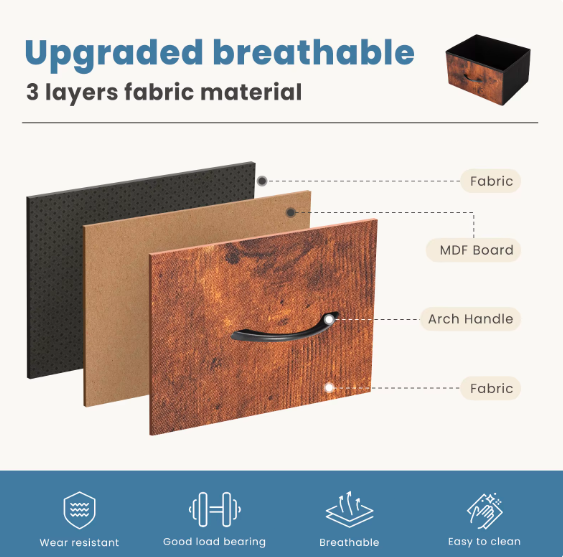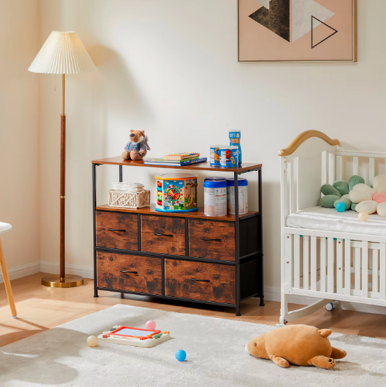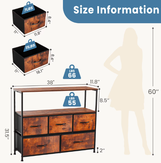 【TV Stand with Storage】This TV Stand comes with 5 removable drawers that offer ample storage capacity for organizing various items. Each large drawer can store at least 12 ordinary adult T-shirts or 7 pairs of jeans. And small drawers can be used to store socks, gloves, underwear, etc. The full size of this TV stand 5-drawer dresser is: 11.81" D x 39.4" W x 31.5" H. 【Safe ; Sturdy】 This chest of drawers uses a thickened metal frame to keep the fabric dresser stable, with 4 adjustable feets to protect your floor from scratches, and you can adjust the balance of the dresser in small areas. Using the anti-tilt device, an auxiliary feature can be added if the dresser is attached to the wall, as it prevents falling caused by uneven floors or children climbing. 【Vertical Uses】 The dresser reduces the restrictions of use. You can use it freely with your existing furniture, such as replacing the TV stand in the living room (for TV up to 45 inch), or as a dresser, bedside table, wardrobe in the bedroom, or as a shoe cabinet in the porch, corridor, hallway, etc. This fabric organizer is Lightweight and can be moved anywhere without much effort. 【Lightweight and Practical】 The TV Stand features 5 fabric drawers, easy-pull handle and wooden board shelves, the whole dresser weight 28 lb, making it a lightweight and versatile addition to any bedroom or living room. The media console can serve as a space-saving alternative to a bulky TV stand, complement a TV console table, or function as an entertainment center in your home. 【Easy Assembly】 With all necessary tools and accessories included in the package , you can easily assemble this TV stand dresser within approximately 20 minutes. If you encounter any difficulties during assembly, we would be more than happy to assist you in finding solutions.