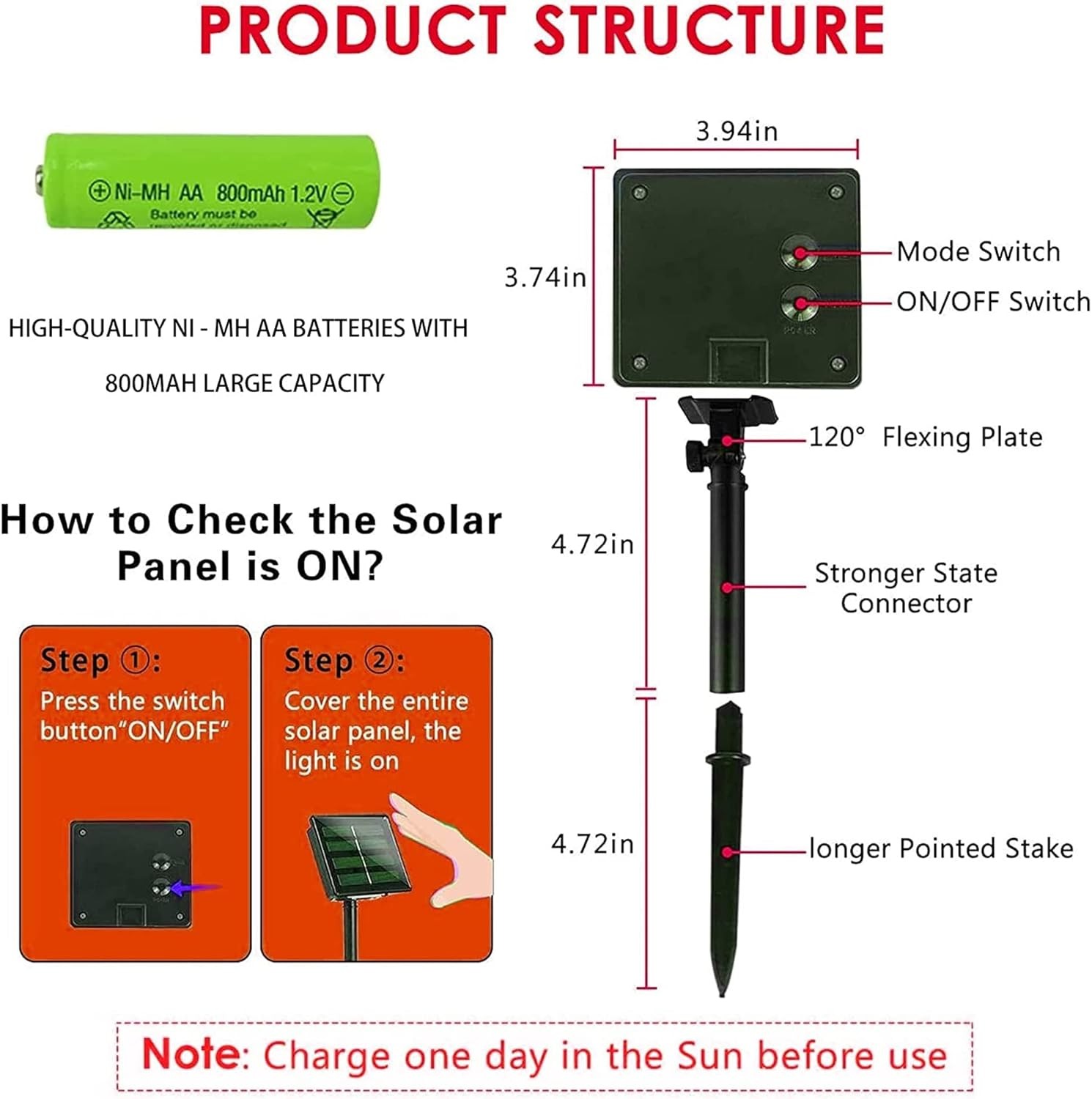 TW SHINE Multicolor Solar String Lights Outdoor, Total 80 2 Pack, Product Details Color: Multicolor Brand: TW SHINE Indoor/Outdoor Usage: Outdoor Special Feature: Waterproof Light Source Type: LED Power Source: Solar Powered Light Color: Multicolor Theme: Christmas Occasion: Christmas Style: Modern Material: Copper Controller Type: Button Control Number of Light Sources: 120 Voltage: 1.2 Volts Bulb Base: Wedge Included Components: 10 LED Lights, 2 Solar Panels Item Weight: 9.1 Ounces Number of Items: 2 Control Method: Touch Water Resistance Level: Waterproof Number of Batteries: 1 AA batteries required. Seasons: Winter Form Factor: String Manufacturer: TW SHINE Item Weight: 9.1 ounces Package Dimensions: 5.98 x 3.98 x 2.05 inches Item model number: SL-04 Batteries: 1 AA batteries required. Special Features: Waterproof Batteries Included?: No Batteries Required?: No Package Dimensions : 5.98 x 3.98 x 2.05 inches; 9.1 ounces Item model number : SL-04 Batteries : 1 AA batteries required. Manufacturer : TW SHINE Color: Multicolor Brand: TW SHINE Indoor/Outdoor Usage: Outdoor Special Feature: Waterproof Light Source Type: LED Power Source: Solar Powered Light Color: Multicolor Theme: Christmas Occasion: Christmas Style: Modern 2 Pack Solar Fairy String Lights: TW SHINE solar lights comes with 120 LED bulbs. The solar lights is 39.4 ft, lead wire is 6.5 ft, bulb spacing is 3.94 inch. Total length is 45.9 ft. Sufficient length to wrap anywhere. Waterproof and Safety: IP 44 waterproof level can reduce the safety hazards caused by bad weather such as heavy rain and snow. Just put it in the sun to recharge and automatically light up when it's dark. Solar Power Supply: Solar powered, no need to replace batteries, auto on at night, and auto off at daytime, saving energy and protecting the environment. Let life becomes more efficient and more convenient. Each solar panel is equipped with Ni-MH AA 800m AH battery, it can work for 10 to 14 hours when fully charged. Flexible Solar String Lights: The copper wire material can be easily transformed into the shape you want, or wrapped around tree trunks or outdoor fixtures as you like, it will not overheat for hours, safe and durable.