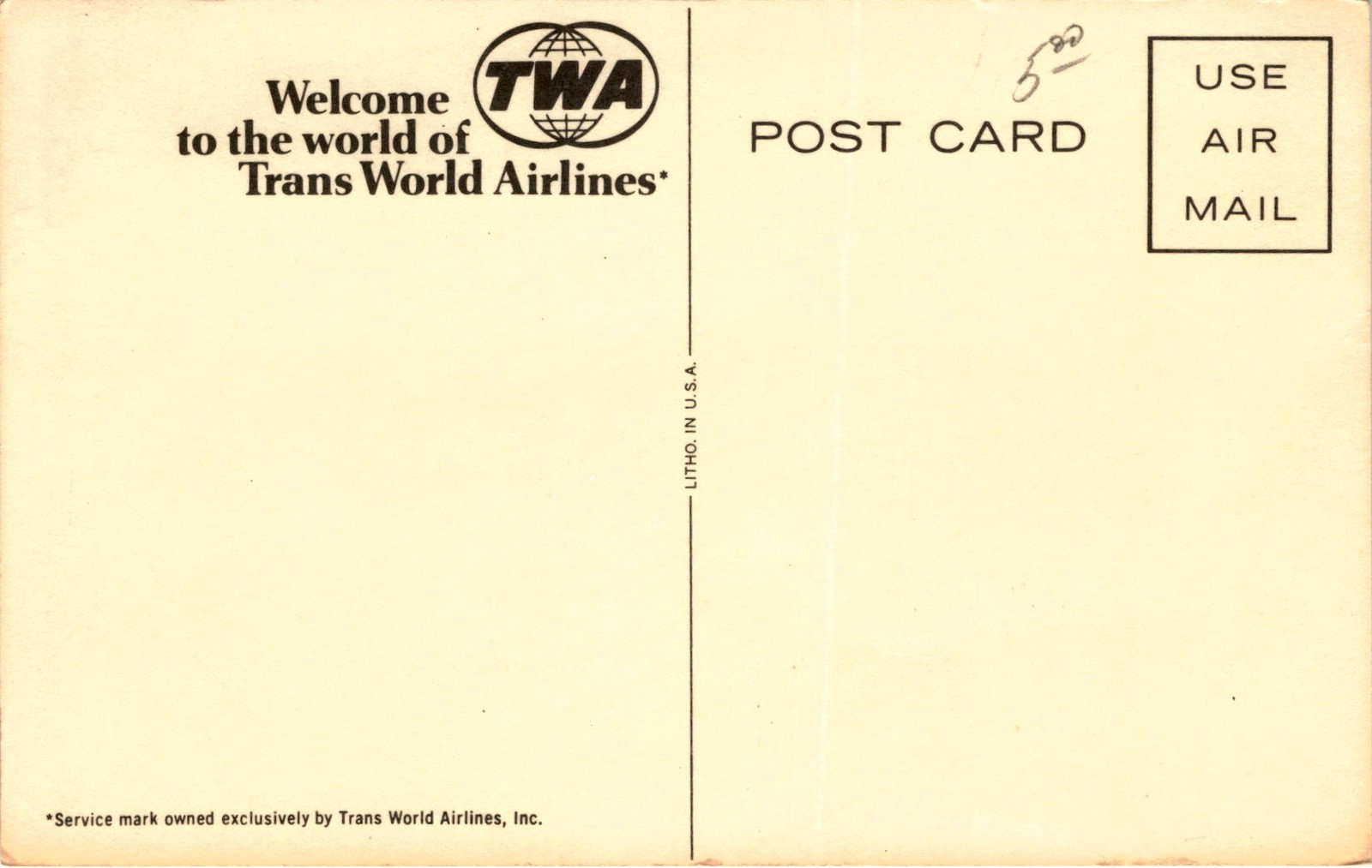 This postcard is a welcome message from Trans World Airlines (TWA) to the recipient, inviting them to the world of air travel. TWA was a major American airline that operated from 1930 until it was acquired by American Airlines in 2001. TWA was known for its distinctive red and white livery and its iconic twin-globe logo.