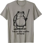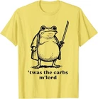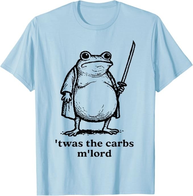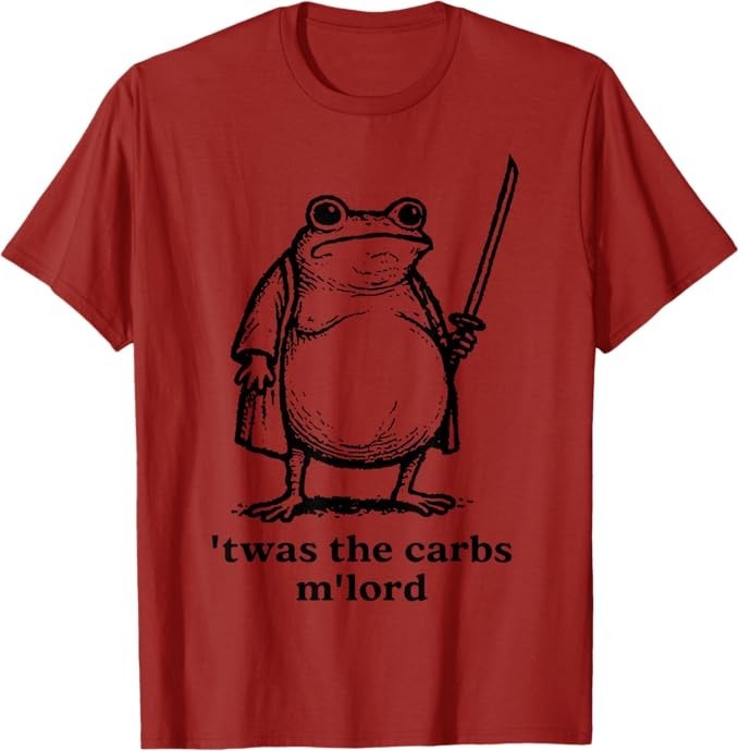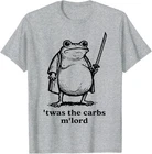 TWAS The Carbs M'Lord Funny Frog Meme T-Shirt Designed and Printed in USA Product Features: • Classic Look and Feel: This ultra cotton tee offer the timeless appeal of traditional cotton. The high-quality print enhances its casual appearance. • Material: Made from 6.1-ounce, 100% cotton. (Note: Dark Heather variant is 50% cotton, 50% polyester.) • Durability: Features double-needle stitching on the neck, sleeves, and hem for added durability. Designed for a roomy, unisex fit. • Print Type: DTG (Direct to Garment) • Manufacturer: Gildan 5000, 5000b (Made in USA) Shipping Information: • Handling Time: With POD(Print-On-Demand) product model, we typically require about 3 business-days handling time before shipping. In most cases, our handling time’s , rang e from 1-2 business days. • Delivery Time: • USA: Approximately 2 -6 business days • Canada: Approximately 6-10 business days (We currently don’t offer international Shipping) • Worldwide: Approximately 15-25 business days (We Currently don’t offer international Shipping) • Shipping Carriers: USPS and DHL • Note: Business days exclude weekends and holidays. Return & Exchange Policy: • Quality Guarantee: We stand behind the quality of our products and workmanship . Any defects or errors on our part must result in a refund/ replacement at no charge. • Conditions for Returns: Returns are generally not accepted for user errors such as incorrect selection of sizes, designs, or colors. Returns /Replacements are acceptable for damages such as poor printing results, incorrect size or design caused by us. • Note: Please reach out to us if there are any questions or issue s with your item, we’ll do our best to resolve any issue you might have. Note: • We’re glad to have your support! If you have a moment, y our honest feedback is very valuable to us. Thank you!