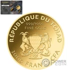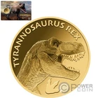 SPECIFICATIONS Country: Chad Year: 2023 Face value: 3000 Francs Metal: Gold .999 Weight (g): 0.031 (1/1000 oz) Diameter (mm): 16 Quality: Prooflike Mintage (pcs): 50.000 Certificate COA: Yes Box: Yes TYRANNOSAURUS REX 1/1000 Oz Gold Coin 3000 Francs Chad 2023 This detailed 1/1000 Oz Gold coin is dedicated to the Tyrannosaurus Rex, a cultural prehistoric icon and subject of fascination for scientists, paleontologists, and the general public alike. The coin comes in a blister with the Certificate of Authenticity incorporated on the back side of it. Limited mintage 50.000 pcs. The reverse of the coin depicts the head of the Tyrannosaurus Rex, the carnivorous dinosaur that lived during the late Cretaceous period, around 68 to 66 million years ago. It was one of the last dinosaurs to exist before the mass extinction event that wiped out this species as well. On the bottom of the reverse, also its distinctive footprint. The obverse of the coin depicts the Coat of Arms of Chad with the inscriptions: "REPUBLIQUE DU TCHAD" – the issuing country, "3000 FRANCS CFA" – the face value and "999/1000 FINE GOLD" – the fineness of the Gold. {IMAGES}