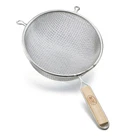 This TableCraft 7‐3/4" diameter tinned double medium mesh strainer has a lacquered wood handle and an outer reinforcing mesh. This strainer is perfect for straining liquids. It includes pan hooks and a flat‐bottom handle for hands‐free use while the strainer balances on the pan's rim. Model #: 98 Flat Lacquered Wooded Handle Double Medium Mesh Pan Hooks Great for Sifting Dry Ingredients Hand Wash "