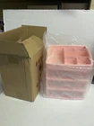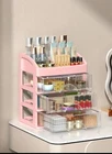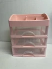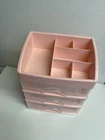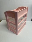Light pink tabletop cosmetic or office /bathroom organizer. It will have 3 drawers with divided exposed compartments on top. It's pretty spacious. It measures approximately 10.5" in height, 8.75" in width and 6.5" in depth. It can also be used as storage for your doll items like clothes, shoes and accessories. No assembly is needed. Material is plastic. Please see pictures.