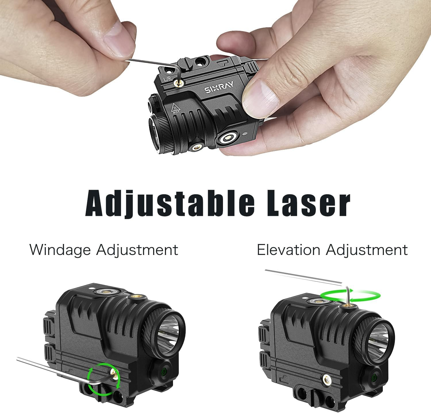 Rechargeable Red Laser and Flashlight for Pistol, 600 Light Combo Product Details Special Feature: Lightweight, Rechargeable Color: Red Laser Light Combo Power Source: Battery Powered Light Source Type: LED Material: Polymer White Brightness: 600 Lumens Included Components: Magnetic Charging Cable, Allen Wrench, Pistol Light Laser Combo Product Dimensions: 1.65"D x 1.17"W x 1.65"H Voltage: 3.6 Volts Light Path Distance: 125 Meters Battery Cell Composition: Lithium Ion Item Weight: 2.05 Ounces Number of Batteries: 1 Lithium Ion batteries required. (included) Brand: SIXRAY Brightness: 600 lumen Battery Description: Lithium-Ion Runtime: 2 hours Style: 600Lumen Red Laser Light Combo Bulb Base: GU10 Mounting Type: Picatinny Mount Recommended Uses For Product: self-defense, law enforcement, hunting Manufacturer: SIXRAY Item Weight: 2.05 ounces Item model number: L5A82R Batteries: 1 Lithium Ion batteries required. (included) Special Features: Lightweight, Rechargeable Batteries Included?: Yes Batteries Required?: Yes Description Pile: Lithium-Ion Special Feature: Lightweight, Rechargeable Color: Red Laser Light Combo Power Source: Battery Powered Light Source Type: LED Material: Polymer Please Note: Pistol must have a Picatinny rail with one slot, and the installation space from the slot to the trigger guard must be greater than 20 mm; Don't fit pistols without Picatinny rail Fit More Pistols: The pistol flashlight laser combo is designed to fit most pistols and can be easily mounted to the Picatinny rail; This pistol light with Three alternative screw holes and Adjustable rail clamp, you can choose the one hole that you want to install (Package comes with Only One screw) Safety and Adjustable beam: The output of the red laser beam Max. 2.788 mW, less than 5 mw, the Class IIIa; This red laser delivers accurate targeting and the adjustable laser keeps your aim steady 600 Lumen White Light: Enhance your accuracy with the pistol light laser combo, perfect for low light conditions; The pistol flashlight combo with a powerful 600 Lumen flashlight, 125 meters concentrated beam distance, Constant strobe and Momentary strobe features Durable and Compact: The pistol laser light combo is constructed from durable materials for long-lasting performance; The red laser flashlight combo is easy to use, with intuitive controls that allow you to quickly switch between the flashlight and laser modes; Compact, Lightweight (2.05 oz, 2.32x1.17x1.65 inches) design makes this handgun red laser light combo useful in self-defense, law enforcement, and hunting applications