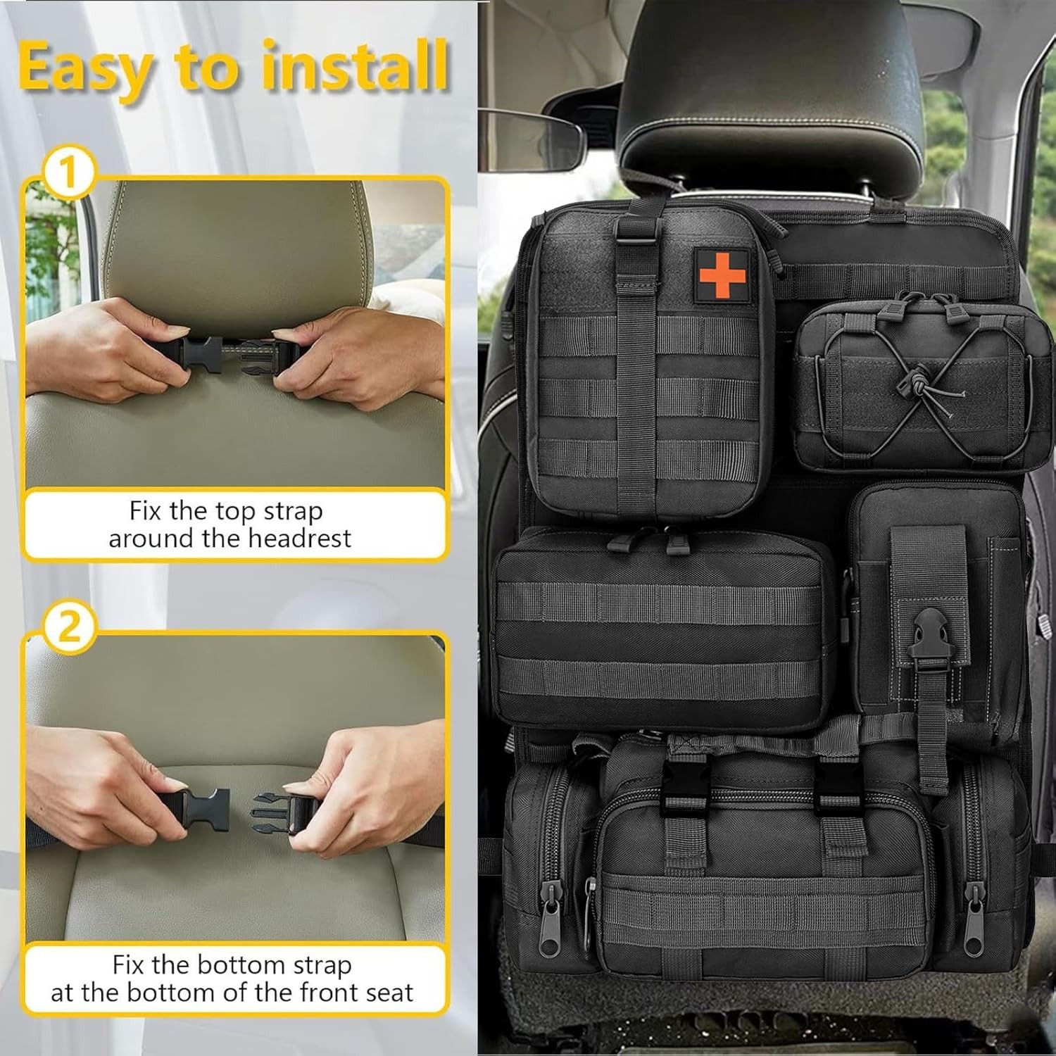 Universal Tactical Car Seat Back Organizer with 5 Detachable Molle Black Product Details Specific Uses For Product: Automobiles Material: Oxford Cloth Special Feature: Detachable Color: Black Brand: Yuehuamech Finish Type: Chrome Product Dimensions: 14.6"D x 14.6"W x 21.7"H Number of Items: 1 Manufacturer: Yuehuamech Item Weight: 3.26 pounds Country of Origin: China Style: fashion Finish: Chrome Item Package Quantity: 1 Special Features: Detachable Included Components: Hanging bag Batteries Included?: No Batteries Required?: No Specific Uses For Product: Automobiles Material: Oxford Cloth Special Feature: Detachable Color: Black Brand: Yuehuamech Finish Type: Chrome Product Dimensions: 14.6"D x 14.6"W x 21.7"H Number of Items: 1 Manufacturer: Yuehuamech Item WeightUnit Count: 1480 Grams1.0 Count Oxford cloth Multi Storage Pockets: This tactical seat back organizer features a versatile design with 5 detachable Molle pouches of varying sizes, allowing you to easily organize and store tactical gear, personal items, and essentials. The tactical pocket, phone pocket, tactical waist bag, large capacity bag and first aid pouch ensure everything has its place, maximizes space efficiency. Perfect for keeping your gear sorted and accessible, whether youre on a road trip, hiking, or in tactical training High Quality Materials: Crafted from premium 600D Oxford cloth, this organizer is built to last. The material is wear- resistant, tear- resistant, and washable, ensuring long- lasting durability. Its water- resistant and breathable properties protect your belongings from dust, and daily wear and tear, making it a reliable choice for any adventure Effortless Installation& Universal Fit: Designed for convenience, this car seat storage comes with an adjustable strap system that securely fits around most car headrests and between the seat back and base. The universal fitment makes it compatible with cars, SUVs, trucks, and more. Simply measure your car seat to ensure a perfect fit, and enjoy a hassle- free setup that adapts to your need Great Storage System: With dimensions of 21. 7 x 14. 6 inches, this seat back organizer offers ample storage space for items of all sizes, from files and tools to cosmetics and first aid supplies. The expandable design ensures you can store everything you need, while the detachable molle bags allow for easy customization. Whether in your car or separated for outdoor activities, this organizer keeps your essentials within Versatile Use for Any Activity : This multi-purpose tactical waist bag is not just for your car—it’s perfect for climbing, hiking, tactical training, daily patrols, and road trips. The detachable molle bag and easy-to-carry design make it a versatile companion for any activity. Stay organized and prepared wherever you go with this all-in-one storage solution Features: Complete Storage System: Our set includes 1 seat back tactical hanger bag panel, 5 detachable storage pouches ( tactical pocket, phone pocket, large capacity bag, first aid pouch, multi- purpose tactical waist bag ). Large Capacity: Our organizer has a large capacity functionality, making it good for storing files, pens, mobile phones, keys, tools, first aid supplies, cosmetics, and more. Premium Quality: Made of quality oxford cloth, our organizer is sturdy. It can withstand daily use and has a great loading capacity. Versatile Use: Our organizer can be installed in the car or separated for various activities. Each pack is equipped with a system on the back that can be connected with other compatible equipment such as tactical vests and backpacks. Great for climbing, hiking, tactical training, daily patrol, road trips, and more. Fits Most Car Models: Our kit is suitable for most car models, including cars, SUVs, trucks, and more. Please measure your car seat to ensure it is suitable before purchasing. Specification: Type: Seat Back Organizer Color: black Material: Oxford cloth Size: L 21. 7'' * W 14. 6'' Package: 1* Panel 5* Storage Pouch Note: Please allow 1- 3cm ( 0. 39- 1. 18'' ) difference due to manual measurement and slight color variation for different screen settings. Package Including Package: 1* Panel 5* Storage Pouch