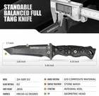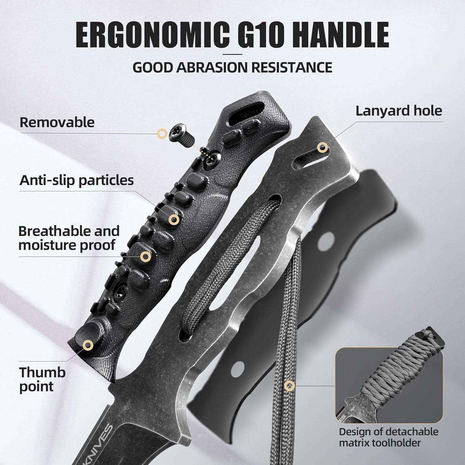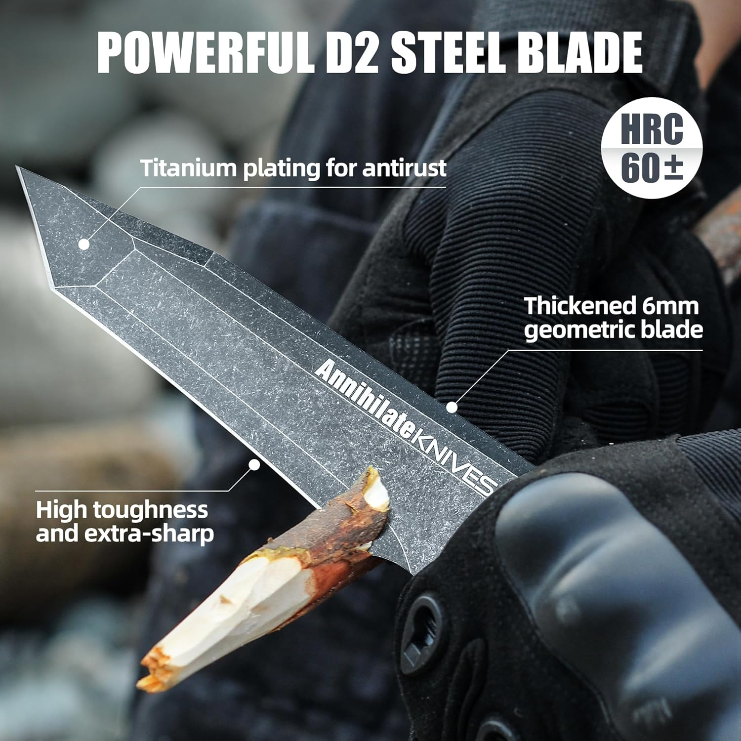 Very sharp out of the box:3.85"(9.8cm) blade edge length; 9.45"(24cm) total knife length; 302g weight. The survival knife has a full tang keel/backbone thickness of 0.24 inches (0.6cm), which is a one-piece keel and is considered the most durable and solid knife structure. Razor-Sharp D2 Blade: The camping fixed blade features a D2 steel blade, which is renowned for its superior hardness and corrosion resistance (HRC60-62°). Its geometric cutter head has a strong piercing ability, making it capable of handling outdoor tasks with ease. Ergonomic full tang Handle: This G10 handle with a textured surface that enhances grip without sacrificing comfort. It provides a secure hold that is resistant to pressure, corrosion, and heat. The end of the handle can also function as a safety hammer. Adjustable kydex sheath: The high-strength, lightweight Kydex sheath allows for versatile angle adjustments. It is easy to attach to your waist or backpack, making it a portable camping knife that you can carry around and enjoy outdoor activities with. Versatile application: Whether you need to prepare food, chopping wood into chips, cut ropes, or break glass for emergencies, it will be your ideal choice. This hiking knife is a reliable outdoor companion for camping, survival, hiking, and others. Product Description ZUNE LOTOO D2 Fixed Blade Tactical Knife As you can notice D2 is a high Chromium steel, which provides hardness and high corrosion resistance, it’s almost a stainless steel in the composition properties. Good Toughness: The D2 offers a good toughness, not the best one but still a decent toughness. Good edge retention : The D2 has a HRC that can reach 62HCR, which result in a great edge retention. Wear and rust resistance: It has a good wear resistance, that’s why knife maker are attracted to it. Fixed blade survival knife with kydex sheath Waterproof and Scratch resistant (Rockwell “R” hardness of 90) Holds its shape and will not alter unless forced under certain conditions Low maintenance-Able to simply wipe clean Usually as the knife is re-inserted into the sheath, you will hear a ‘click’ sound which helps you know your knife is safety secured. Lasts longer and it’s far less likely to damage your knife, no matter how many times you remove and re-place it in the sheath. The sheath attachment adjusts for belt / pack strap thickness. Can be turned in 90 degree increments to wear the knife handle up, down, front or back.(Change the orientation with screws) FULL Tang Survival Knife with 6.15mm Spine In the knife world, there is a difference between "cut" and "slice". The thinner the blade, the better a knife is for tasks like cutting and slicing. A thinner survival knife allows more accurate control when you’re slicing up meat or vegetables, but what if you have to do some chopping or batoning? These actions can be carried out with thinner blades, but it’s not ideal. Whenever you perform these tasks, you need some weight behind your blade: tackling wood with a ¼” blade is going to be easier and more efficient than using one that's only ⅛” thick. Geometry blade Great for puncturing Tail hammer Used for emergency safety hammer G10 handle Corrosion resistance and heat resistance, providing high friction and comfortable non -slip grip DIY Tang Remove the shell, fix it with a paracord, and tie it to your hand, making it more stable when surviving in the wild Sharp out of the box The sharpest edge is achieved using D2 Steel Survival Knife A proper survival knife should be enough to deal with all kinds of emergencies, even as a barbecue stick