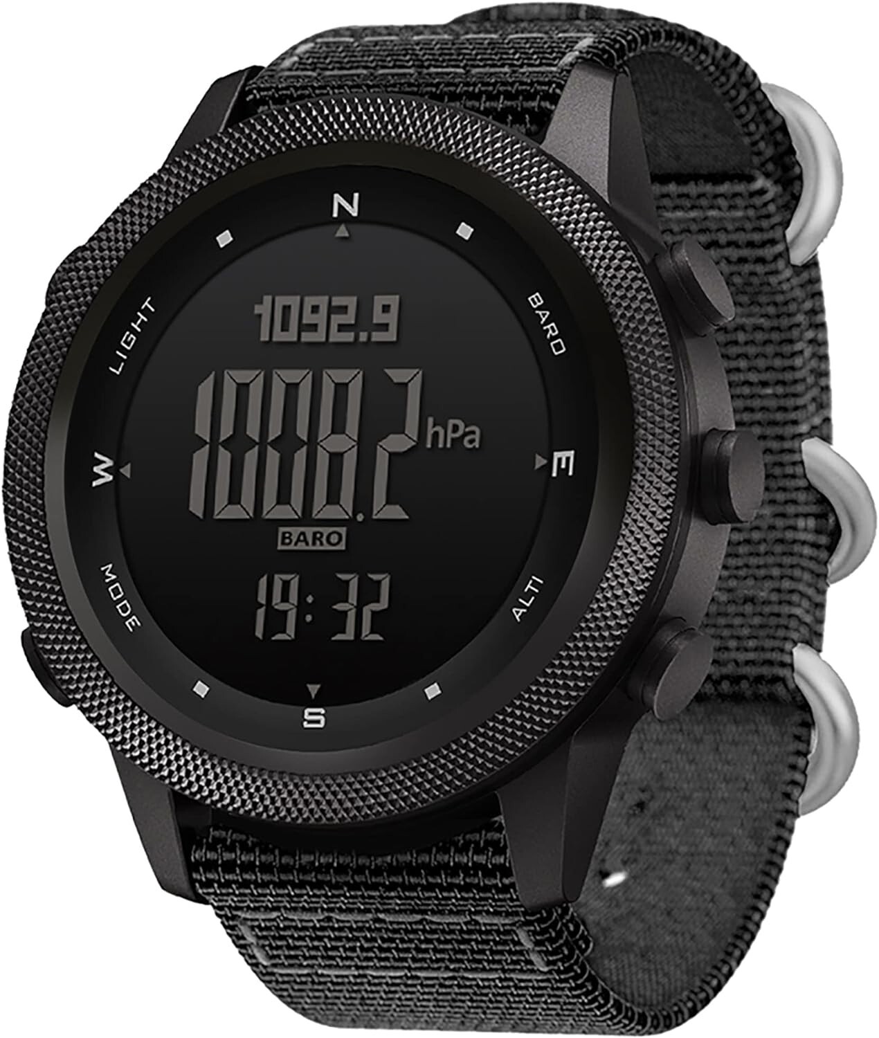 Tactical Military Watch - Digital Outdoor Sports Watch for Men, Pedometer, Compass, Calories, Durable Nylon Band, Model: Dimensions: 46x46x14mm | Weight: 95g ( Display: FSTN | Strap: Durable Nylon | Waterproof: 50M Sensors: Altimeter, Barometer, Compass, Thermometer, Pedometer Compatibility: Weather tracking, swim-proof design, and military-standard durability. Specification Time Functions Hour, Minute, Second, (2000-2099), , Date, Weekday Countdown Timer 99hours59 minutes seconds Alarm Clock 2 Sets Alarm Clock Corporates Digital Compass, Altimeter, Barometer, Thermometer, Air Pressure Trend And Altitude Trend And Altitude Trend El Backlight Air pressure measurement 300~1100mbar/ Height measurement -698~+9164m/-2246~+30067F Temperature measurement 10 ~ + 60 ℃ / 14 ~ 140 ℉ dial material Metal/Glass EL backlight Clear at night Dial thickness