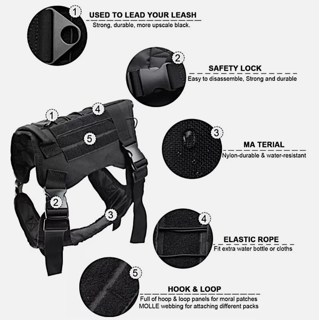 Tactical Dog Harness with Handle No-pull Large Military Dog Vest US Working Dog Features: Quick release side buckles : The buckles are located on each side of the tactical dog vest near the belly. These tough plastic buckles will all you to quickly and easily take this military dog harness off and on. Velcro Side Panels : Multiple Velcro panels are located down each side of the tactical dog vest. These easily alloy you to securely put morale badges or a name tag on the side making it nice and visible for the public to see and be aware. This is a great spot to attach a “Service Dog” patch if necessary. Molle loop System : Located down each side of the vest are two rows of Molle loops or (Modular Lightweight Load-carrying Equipment) A molle dog harness will allow you to attach accessories such as bags, pouches, or water bottles to the side of the tactical dog vest for your dog to easily carry. A great example is attaching a small first aid kit so it is easily accessible. Elastic Rope : O n the topside of the tactical dog vest there is an adjustable elastic rope. Easily secure items underneath it such as water bottles. Or this can be used to tighten the vest if you need to fine tune the fit of the vest around your dog. Top mounted handle : This durable and strong handle on the top of the vest lets you, grab, lift or carry your dog if needed. This feature works great wile on a hike if your dog requires assistance getting over specific rocks or other terrain. The location makes it a safe and comfortable lift for your dog and also makes it easier for you to have a handle to lift them with. Quality Stitching : Expertly stitched with high quality threads at every joint and load bearing point to ensure a safe functional tactical harness that is built to our standards and made to last. Great for: Service dogs, Police and other law enforcement, Hunting dogs, family pets on outdoor camping and hiking trips. Specifications: Color: Black/Army Green/Khaki Leash Length: 38.19-59.06”/ 97-150cm (adjustable) Fit for: Medium large dogs.e.g. German Shepherd, German Doberman Pinscher etc N otes: Due to the light and screen setting difference, the item's color may be different from the pictures. Feedback: Your feedback is very important to us and all buyers. Please take a few seconds to leave a great feedback if you are satisfied with our product and service. We will try our best to solve the problem and leave you a happy shopping here. Please contact us before leaving any neutral or negative feedback. We always consider our customers to be our number one asset. Please feel free to let us know if there are any problems or inquiries with an item and we will take care of it for you. so that we can resolve the issue in the best way possible without having to open a case through eBay and without negative feedback. Thank you! On Dec 24, 2025 at 18:30:54 PST, seller added the following information:
