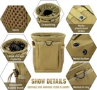 Feature: 1. MULTI-POCKET DESIGN: Ammo dump pouch with front pocket with hook & loop closure, two mesh bag on both side has good flexiblility while you need any extra sotrage flashlight or small items. The main bundle pocket with drawstring closure. 2. ESSENTIAL FOR SHOOTING ASSISTANCE: Magazine Dump Pouch is essential for improving the speed of magazine change, instead of dropping your mags on the ground and getting them muddy or worse losing them, allows you to quickly store your shooting gear into a convenient pouch when you need it. 3. GOOD SOLUTION FOR MAGAZINE RETENTION: Mag dump pouch is a large storage room for your magazine, one main drawstring open top pocket able to hold 6 AR or AK 30 round magazines, shotgun rounds, EDC/NVB carrier. 4. MOLLE SYSTEM: Molle dump pouch can be easily attached on your tactical vest, backpack or any MOLLE-Webbed panel. Reduce a reload time and loss rate. Great choice for painball, wargame, shooting and hunting. 5. DURABLE AND RESISTANT METRAIL: Molle dump pouch is made of 600 denier High-Spec Nylon fabric with Teflon water-resistant coating. Size: 3*6*8 inches. Package Includes: 1x Tactical Magazine Utility Drop Dump Pouch