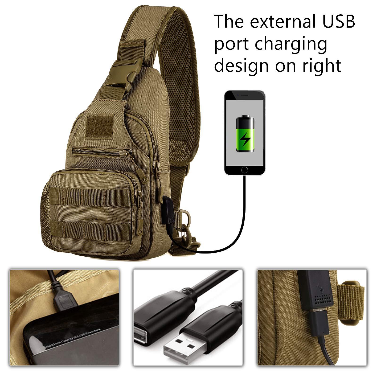 Tactical MOLLE Sling Bag with USB Charging Port and Adjustable Chest Strap