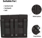 Product Description Features: 1. Made of high-quality encrypted nylon fabric, scratch-resistant and wear-resistant. 2. HOOL&LOOP, convenient and practical. 3. MOLLE system design, can be hung on a backpack with molele system. 4. Strong buckle, strong and safe. Specifications: Material: 600D N ylon fabric Size: 24*20 cm / 9.45X7.87 inch Weight: 247g Color: Black, Khaki, Army Green,CP,ACU Package Included: 1x Triple Magazine Pouch (Magazines are not Included) Note: 1. Above the size of manual measurement, there are 1-3CM error. 2. Due to the difference between different monitors, the picture may not reflect the actual color of the item, please refer to the actual product.