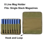 8 Line Design:Fits Single Stack Magazines DURABLE MATERIAL: Magazine Storage Pouch constructed by high quality military durable1000D Nylon material, tear-resistant, wear-resistant, special loop design on the outside that can stick your favorite . MOLLE SYSTEM: The molle Line Magazine Pouch can attach to tactical vest, belt, drop leg platforms,pack or other MOLLE gear; Easy attachment and removal. PERFECT PRACTICALITY:The adjustable Velcro flap secures your gear in place, and Mag Pouch with Removeable Flaps gives you faster access to your gear on the move. FUNCTION VERSATILITY :Great as a Glock magazine holder, 1911 magazine pouch, .22 magazine pouch, 9mm magazine pouch,just to name a few. Fits all types of and handgun magazines.Transport this magazine holder in of several ways. SATISFIED PURCHASE:We manufacture our products according to the highest quality standards,Thank you for your trust in . You buy are 100% risk-free, We try our best to provide you with the best service. We are committed to 100% customer satisfaction.We need your support and Thank you for your affirmation.