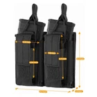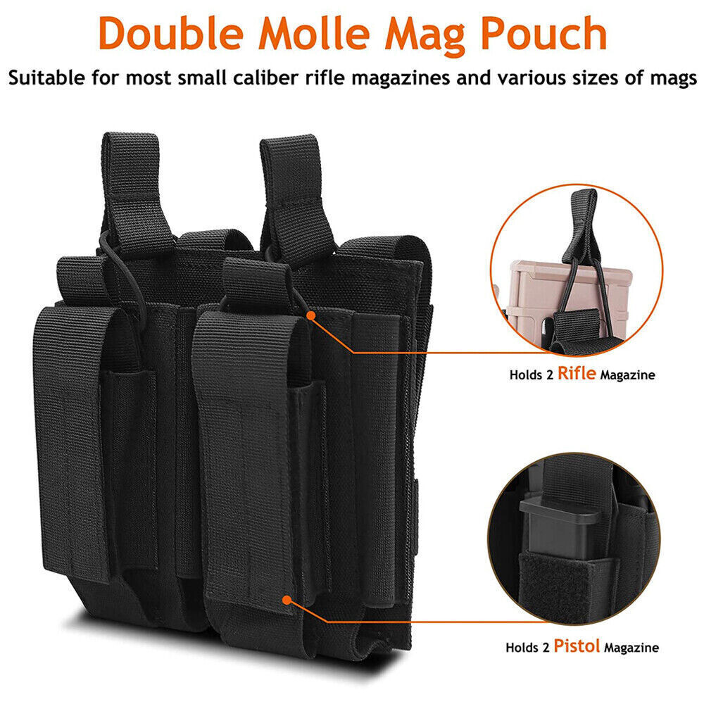 Features: Double-Layer holder New Design: new upgraded, it hold twice layer magazines ,one layer to fasten Rifle Mags and One layer to fasten Pistol Mags; Double compartments design keep your item in order and in reach,to keep your magazines not falling; Hook&Loop Fasten Design ,fast and easy to open the top and close Molle System:Molle Webbing at the back can be attached to Molle Gears ,including Tactical Vest/Belt/Backpack etc. 1. Item Type: Tactical Molle Magazine Pouch 2. Material: Durable Waterproof 1000D nylon 3. Color: Black 4. Weight: 140g approx 5. Type: Double Mag pouch: 2+2 Mag Holder 6. Double Mag Pocuh: 6.2*1.2*5.3in Package Includes: 1* Tactical Double Mag Pouch