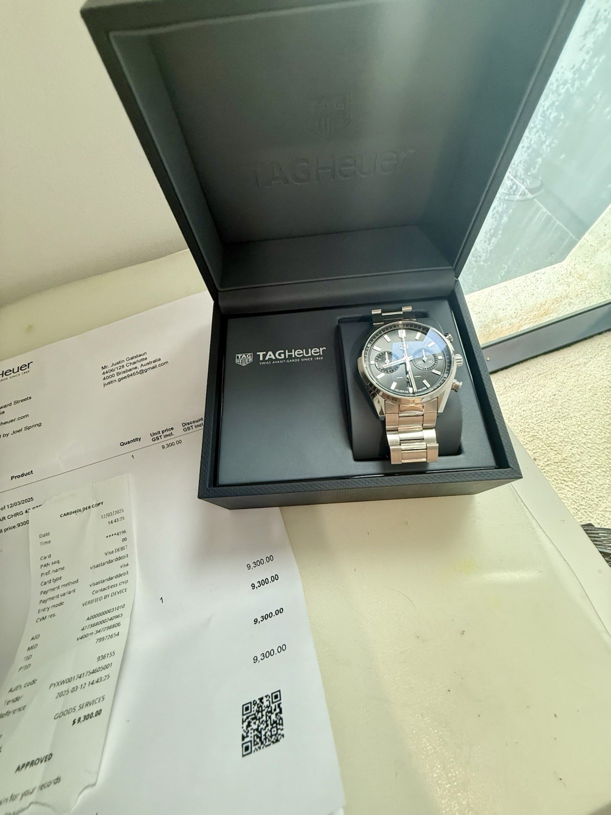 Embrace the elegance and precision of the TAG Heuer Carrera Chronograph 42, a timepiece that seamlessly combines style with functionality. The iconic design showcases the brand's commitment to quality, featuring a chronometer that guarantees accurate timekeeping. This wristwatch is a testament to sophistication, suitable for both casual and formal occasions. With its sleek craftsmanship and the reputable TAG Heuer heritage, the Carrera model is a staple for watch enthusiasts. It boasts a sleek profile and a durable construction that is synonymous with the luxury watch industry. This timepiece is an investment in both time and style, designed to complement the modern man's lifestyle. Box: Yes Papers: Yes Condition: like brand new purchased on the 12th of March RRP: $9,300