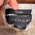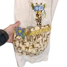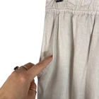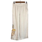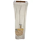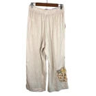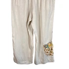 Great Pre-Owned Condition (see pics for details). No holes, rips or stains. Pull on style Two front pockets Elastic waistband High waisted Cropped to ankle length depending on height Cargo style pocket adorned with giraffe print fabric, adorable giraffe applique, ruffle and crochet 3D flowers 100% linen, machine washable Style profile - casual, animal print, fun, breathable, embellished, artsy, art to wear, unique, vacation, cruise, spring, summer Approximate flat lay measurements: Waist - 14.5" (unstretched) Rise - 12.5" Inseam - 25" Please compare measurements to something you already own to verify size and fit We are happy to answer any questions! We ship the next business day!