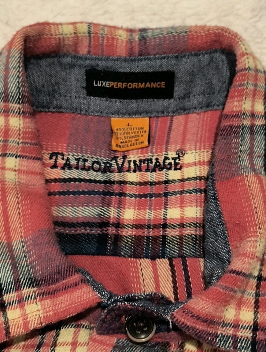The Tailor Vintage Luxe Performance Stretch Plaid Flannel Shirt in size L is a stylish and versatile addition to any man's wardrobe. Made from a comfortable cotton blend fabric with a stretch feature, this shirt is perfect for casual occasions throughout the seasons. The shirt's collared neckline and button-up closure give it a classic and modern look, while the red plaid pattern adds a pop of color. With a regular fit and long sleeves, this shirt is machine washable for easy care and is sure to become a favorite choice for everyday wear.