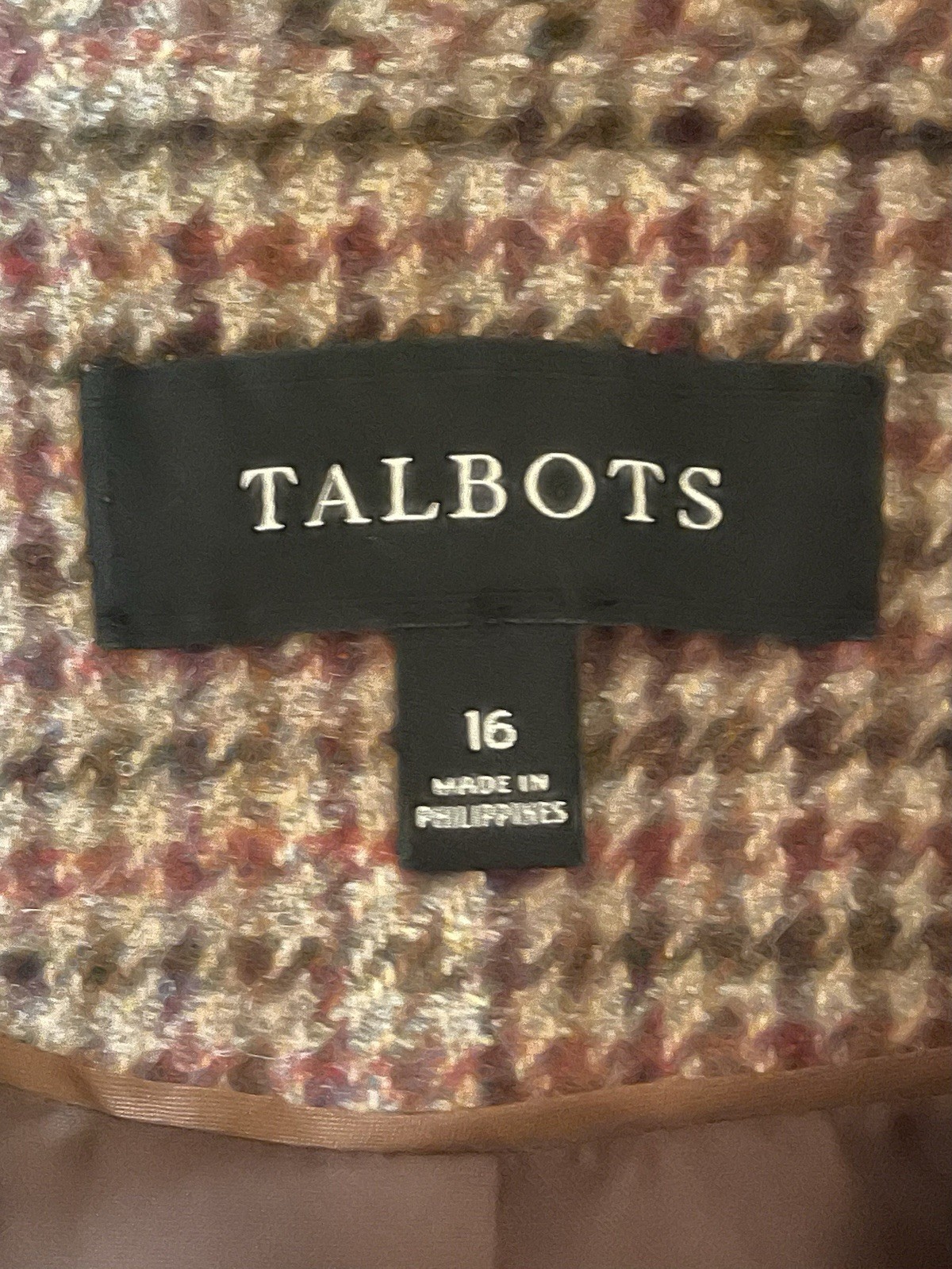 Like new condition No flaws detected Brown check pattern Gold tone button front Ruffle around neck & down front Stand up ruffle collar Front patch pockets 3 gold tone buttons at cuff Ruffle back waist Fully lined Approximate flat measurements: Shoulder 16.5” Chest 22” Sleeve 24” Length 26” front / 23.25” back Shell: 48% wool / 27% polyester / 25% viscose Lining: 100% polyester Dry clean