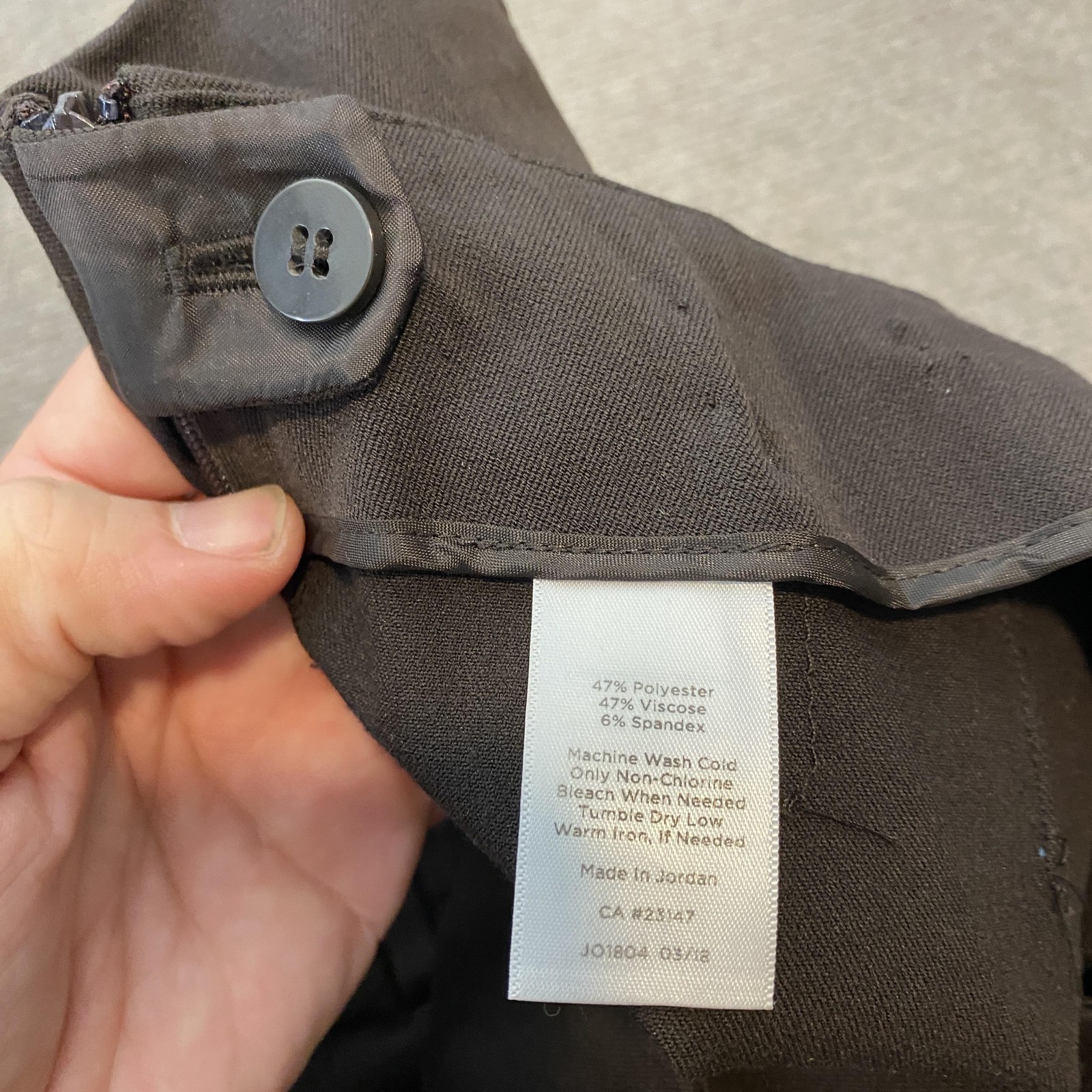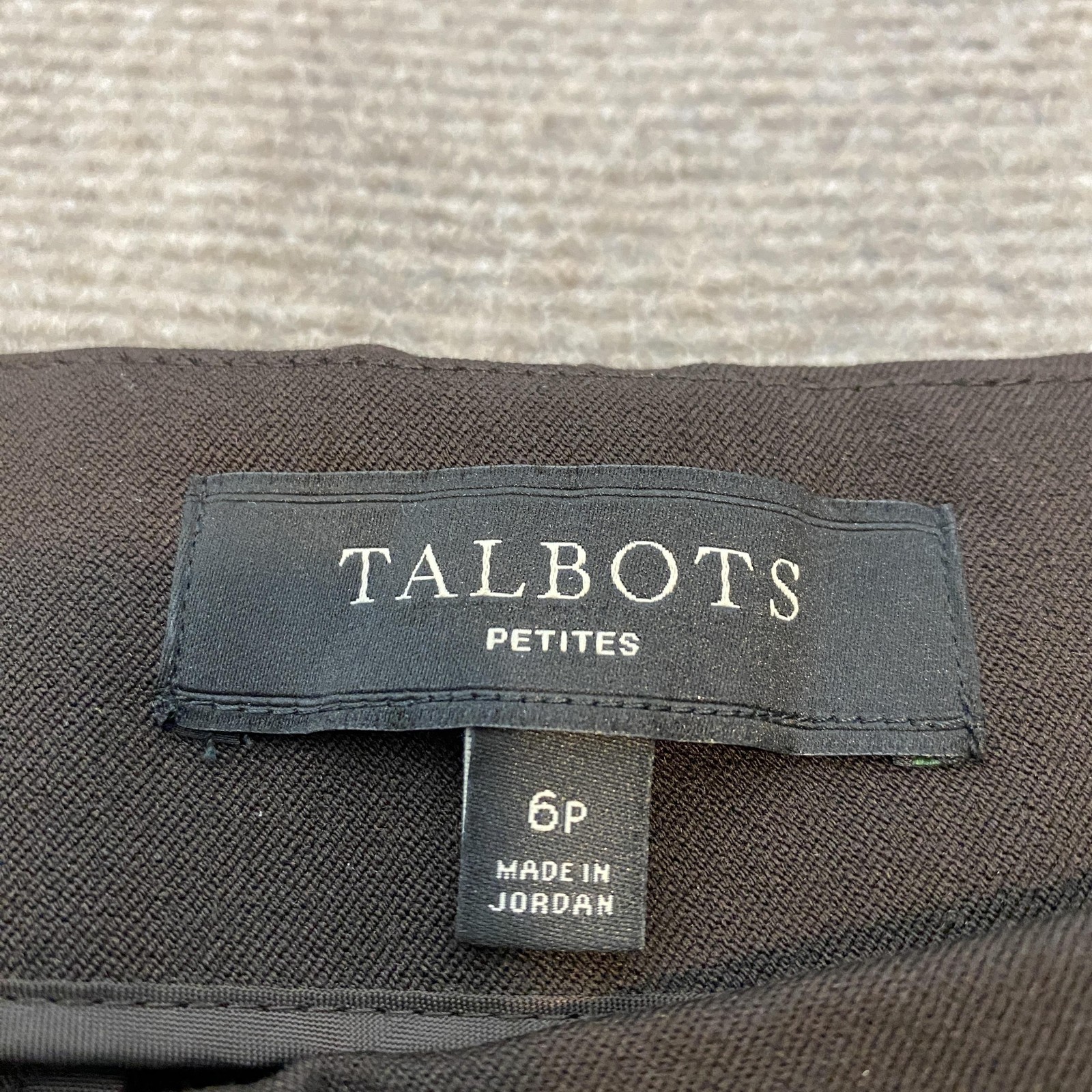 Previously worn with minimal signs of use. Fabric clean and intact with no stains or holes. Zipper, button, and seams secure. Brand: Talbots Petites Style: Womens dress pants in a classic straight-leg silhouette with clean tailored lines. Color: Dark brown solid twill. Size: 6P (Petites). Material: 47% polyester, 47% viscose, 6% spandex for comfortable stretch and recovery. Details: Side zip with inner button closure, belt loops, front slant pockets, back welt pockets, unembellished professional look. Fabric type: Smooth twill weave suitable for business, office, and career wear. Made in Jordan; care tag CA 22147 with additional internal code J01804 04/16.