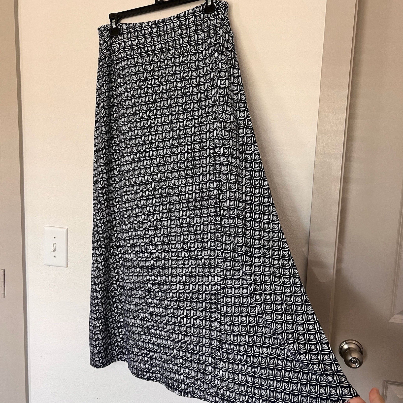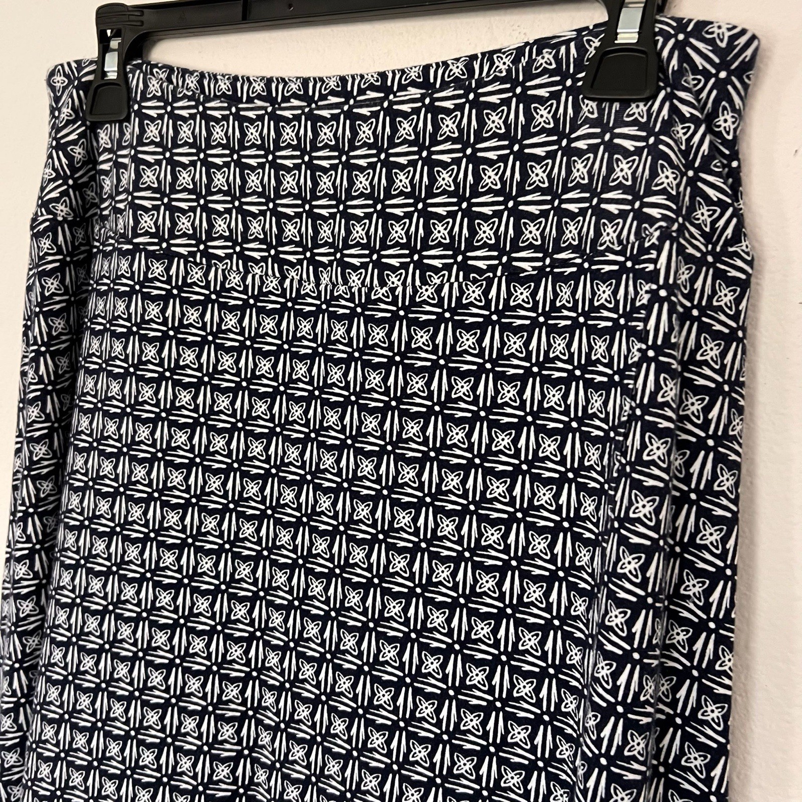Elegant Talbots maxi skirt featuring a navy blue and white geometric floral pattern. Women’s size small. Soft, flowy fabric with a flattering A-line silhouette — perfect for casual outings, office looks, or summer days. Excellent pre-owned condition, no flaws noted.