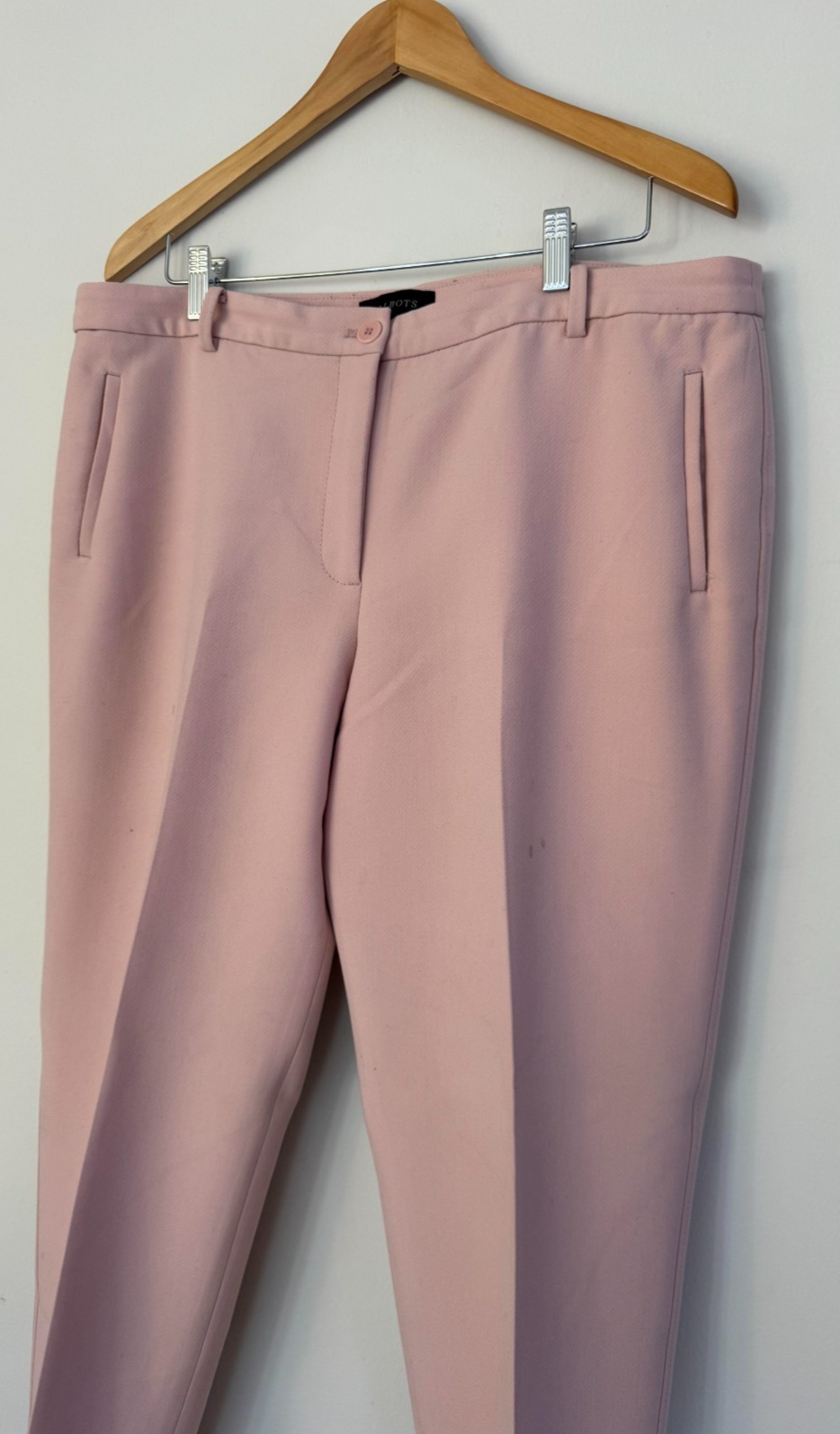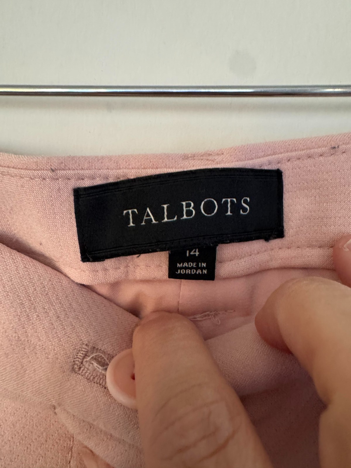 Talbots Hampshire ankle pants in a soft blush pink tone. Tailored slim fit with a clean, polished look that works well for office wear, business casual outfits, or dressed-up everyday styling. Features a flattering straight-to-slim leg, stretch fabric for comfort, and classic Talbots quality construction. Light signs of wear consistent with normal use. Please review photos for condition and details. Approximate Measurements (laid flat) Waist: approx. 16 in (32 in around) Rise: approx. 10.5 in Inseam: approx. 27.5–28 in Outseam: approx. 37 in Leg opening: approx. 6 in Item Specifics Brand: Talbots Model: Hampshire Department: Women Size: 14 Fit: Slim Type: Pants Style: Ankle Pants Color: Pink / Blush Material: Polyester Blend Fabric Type: Woven Closure: Zip with Button Rise: Mid Rise Occasion: Business, Workwear, Casual Pattern: Solid Features: Stretch, Pockets Country/Region of Manufacture: Jordan Keywords Talbots Hampshire pants, women’s ankle pants, pink work pants, slim fit trousers, business casual pants, office wear women, stretch dress pants, classic preppy style