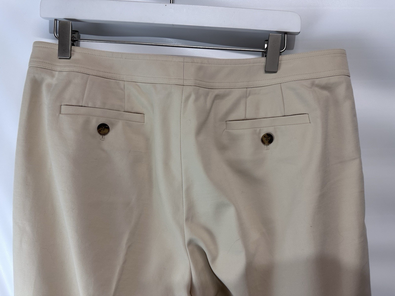 The Talbots Khaki Dress Pants are a stylish and versatile addition to any woman's wardrobe. Made from a comfortable blend of spandex and cotton with a stretch feature, these chino trousers are perfect for both casual and business occasions. The beige color and classic chino style make them easy to pair with a variety of tops and shoes. With a zip and hook & eye closure, these pants offer a secure fit and are machine washable for easy care. The size 14 and 33-inch waist make them a flattering and comfortable option for any woman looking for a high-quality pair of pants.