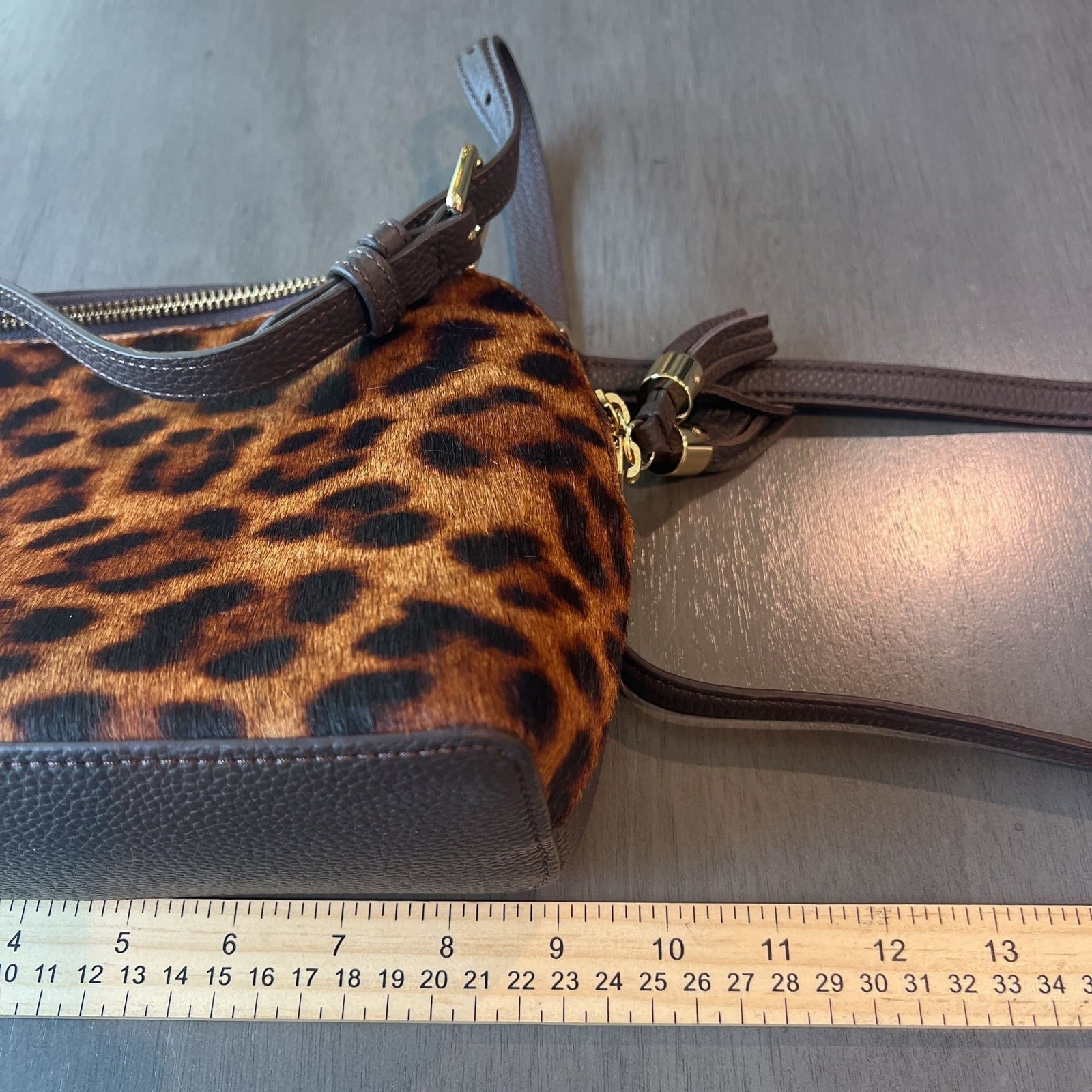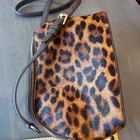 Talbots Leopard Print Calf Hair and Leather Crossbody Bag. This chic accessory features a genuine calf hair front with a bold animal print and a textured pebble leather back and bottom. Features: - Adjustable leather crossbody strap - Gold-tone hardware accents - Top zip closure with leather tassel pull - Vibrant red fabric-lined interior - One interior zip pocket and one slip pocket - Exterior back slip pocket for easy access Condition: New without tag. Dimensions are approximately 8.5" L x 5.5" H x 3" D.