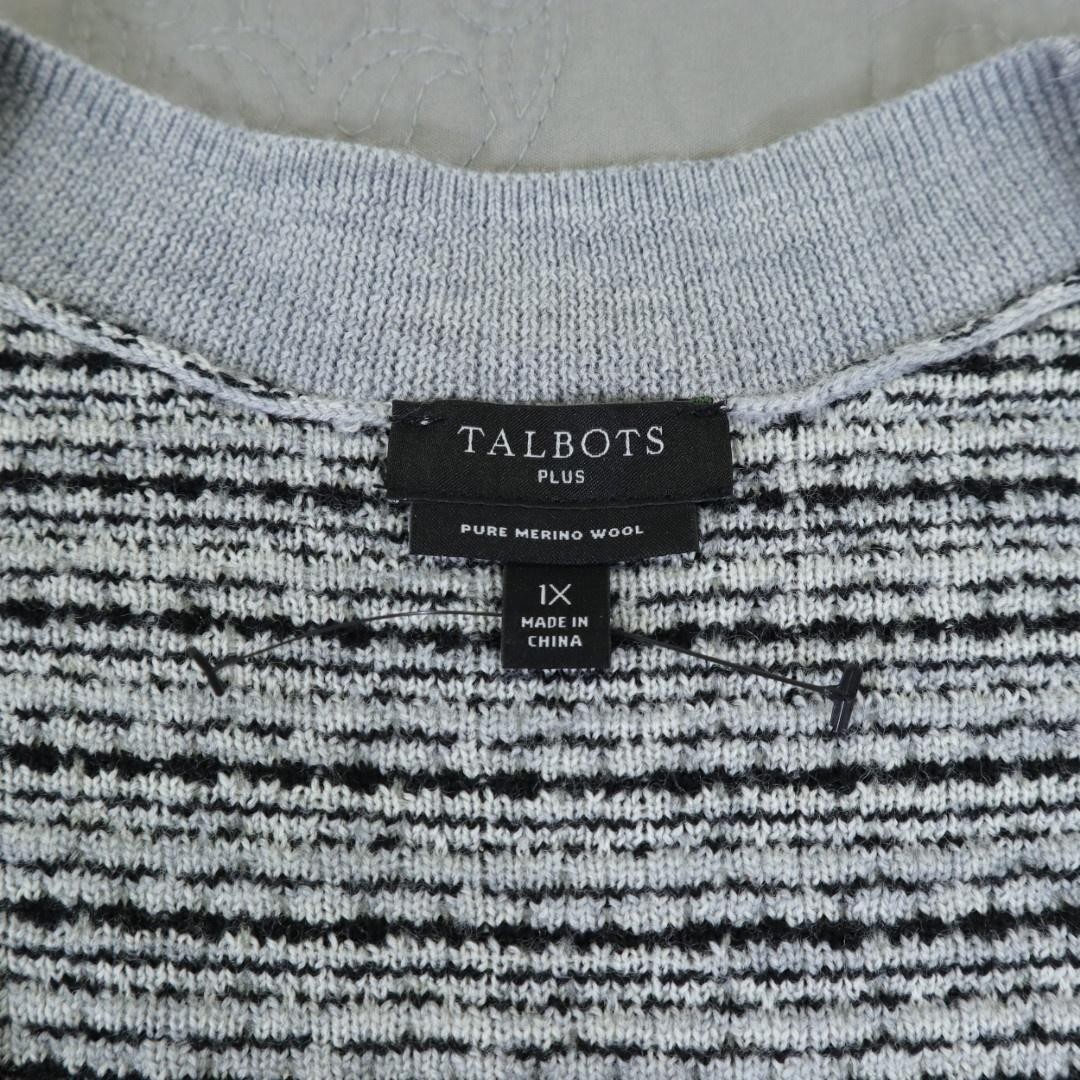 Brand: Talbots Style: Womens plus size button-front cardigan sweater with V-neckline and long sleeves. Color: Gray and black woven pattern with solid light gray ribbed trim and placket. Material: 100% merino wool; tag notes "Pure Merino Wool." Size on tag: 1X (Talbots Plus). Details: Pearl-style decorative buttons, two front welt pockets, rib knit cuffs and hem, soft knit texture, classic tailored look. Care instructions (per tag): Hand wash cold, use only non-chlorine bleach when needed, reshape and lay flat to dry or dry clean, do not iron decoration. Additional tag information: Made in China; CA# 23147; CN4982 04/22.
