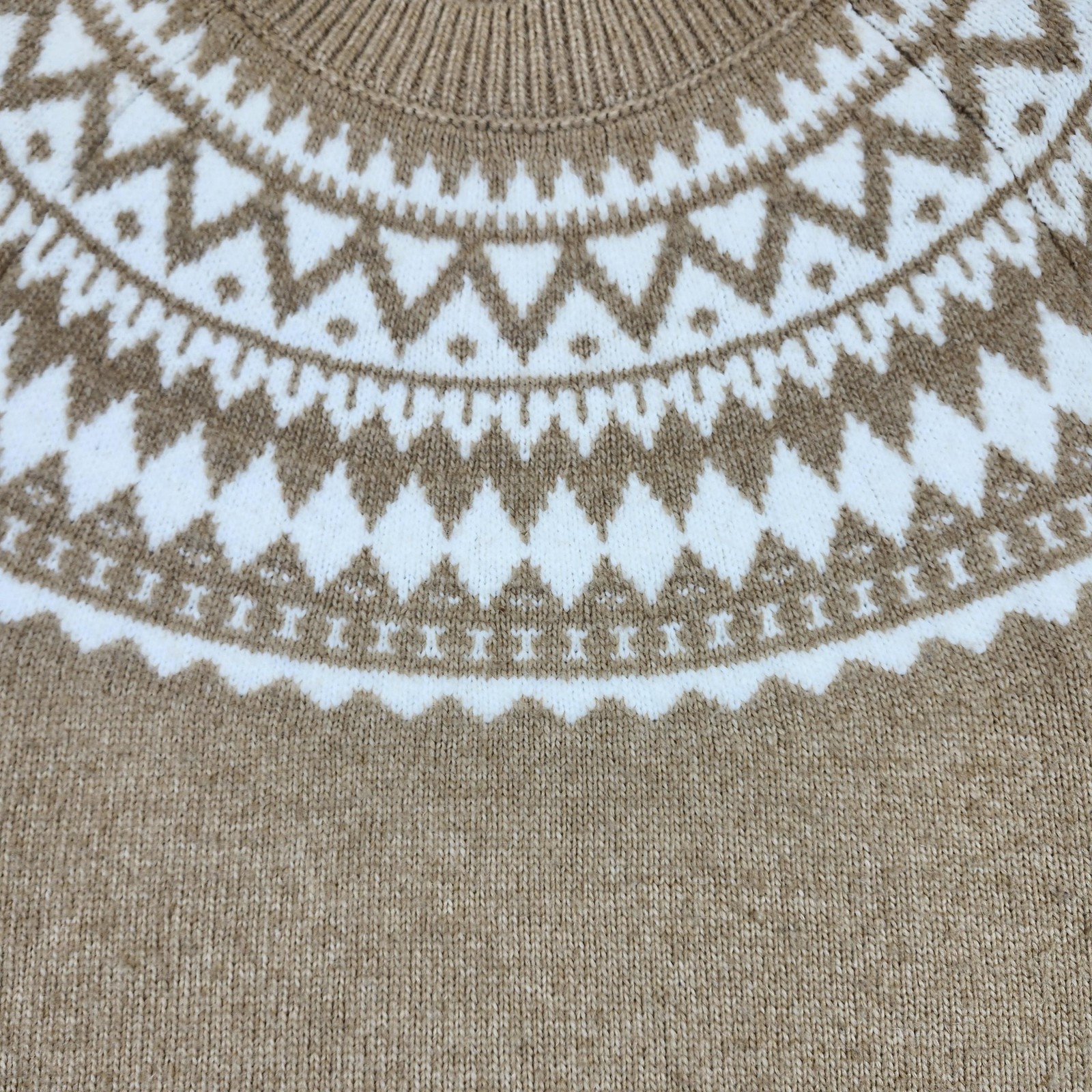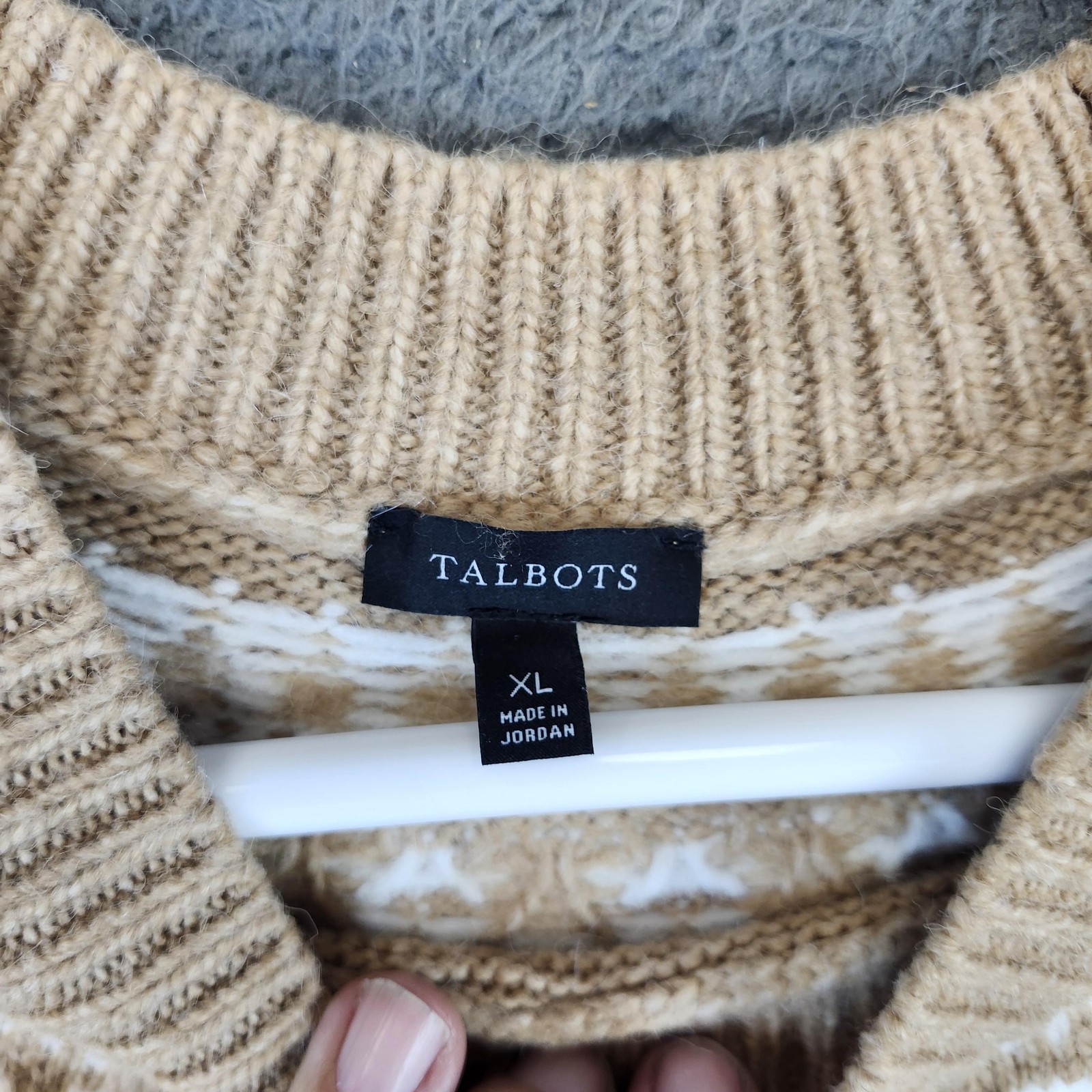 Brand: Talbots Item: Womens crewneck sweater pullover Tag size: XL Made in Jordan (per neck tag) Color: Tan/Camel with white Fair Isle/Nordic yoke pattern Design: Ribbed crew neck, cuffs, and hem; long sleeves Knit construction for soft, cozy feel Classic winter/holiday style with geometric yoke design Photos include measurement references for fit; compare to a similar sweater No UPC, EAN, or style code visible on the tags in photos Notes: Talbots branding visible on neck label
