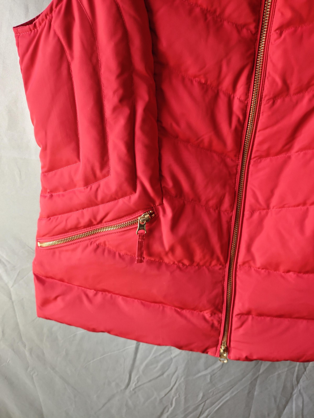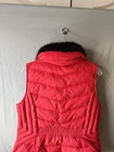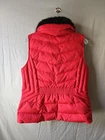 Talbots Vest Womens Medium Red Faux Fur Collar Quilted Zip Puffer Condition: Gently worn, no visible flaws Shell: Nylon/polyester blend with soft quilted padding for extra warmth Features a plush, black faux fur collar for a chic look Gold-tone front zipper closure and two front zip pockets Sleeveless puffer style with stylish chevron stitching details throughout Elastic ruched panel at back waist for improved fit and definition Tag size: Medium (Womens) Approximate measurements shown in photos Classic red color, perfect for fall and winter layering Talbots logo marking on inside neck tag