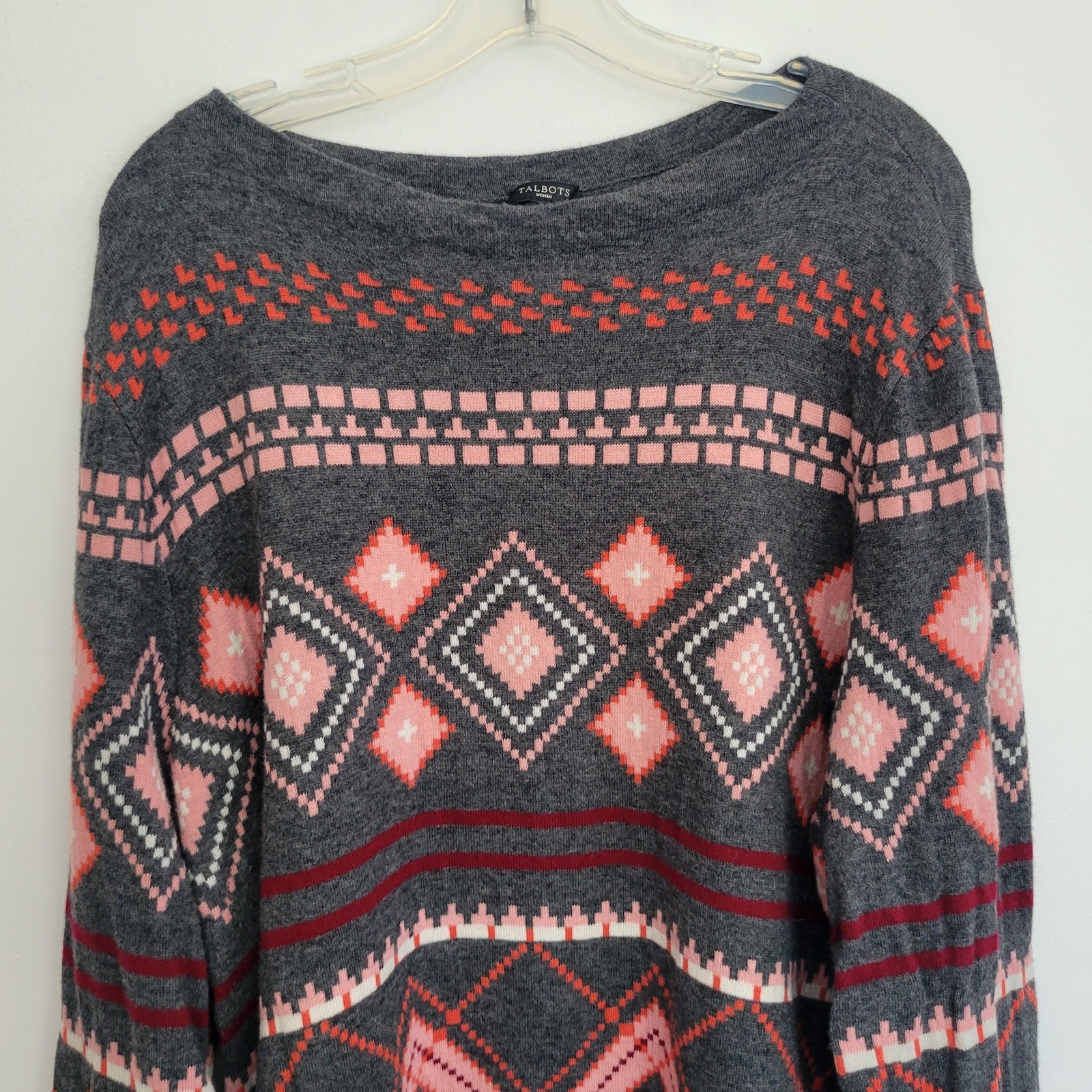 Talbots Woman sweater Size 3X 70% nylon/30% lambswool Hand wash Pullover styling Long sleeves Gray with pink, red, coral geometric and heart design Not heavy and bulky- perfect for fall Approx. lay-flat measurements: Length: ~27.6" Pit to pit: ~26" Sleeves: ~25" Very good pre-owned condition. There is some minor pilling, esp. near underarm area, but no other notable flaws/signs of wear
