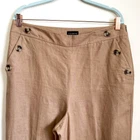 New Flare Leg 100% Linen Talbots High Waisted Nautical Sailor Office Career Casual Art Teacher Capsule Pants Sailor nautical button accents Tan beige neutral camel color Unlined Side zip closure Slant pockets Sz 14 waist 36 rise 13.5 inseam 31 leg opening 11.5 New with tags neutrals office business modern monochromatic coastal lightweight travel academia